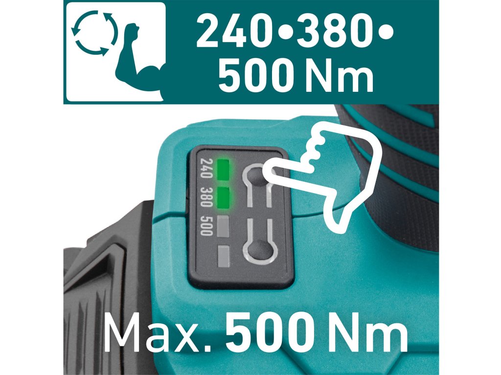 Výkonný bezuhlíkový rázový akumulátorový uťahovač s maximálnym krútiacim momentom 500Nm poskytuje silu potrebnú na široké spektrum prác pri uťahovaní aj povoľovaní skrutiek a matíc. Moderný bezuhlíkový motor má vyššiu životnosť, vyšší výkon a nižšiu spotrebu energie než klasické uhlíkové motory. Uťahovací moment je možné elektronicky nastaviť na tri úrovne: 240/380/500Nm, pričom pri povoľovaní pracuje stroj na najvyššie otáčky. K dispozícii je aj funkcia AUTO STOP, ktorá pri uvoľňovaní uťahovač po krátkej chvíli automaticky vypne, keď je skrutka úplne povolená a nástroj sa voľne otáča. Rázový mechanizmus umožňuje efektívnejšie uvoľňovanie aj silne skorodovaných spojov ako akumulátorová vŕtačka a zároveň šetrí vaše zápästie aj batériu. Celokovová prevodovka uložená v kovovom kryte zabezpečuje spoľahlivý chod aj pri vysokom zaťažení a lepšie odvádza teplo. Pracovné LED svietidlo so oneskoreným vypnutím zlepšuje viditeľnosť a pogumované plochy chránia nástroj pred nárazmi a zvyšujú komfort pri práci vďaka zníženiu vibrácií.