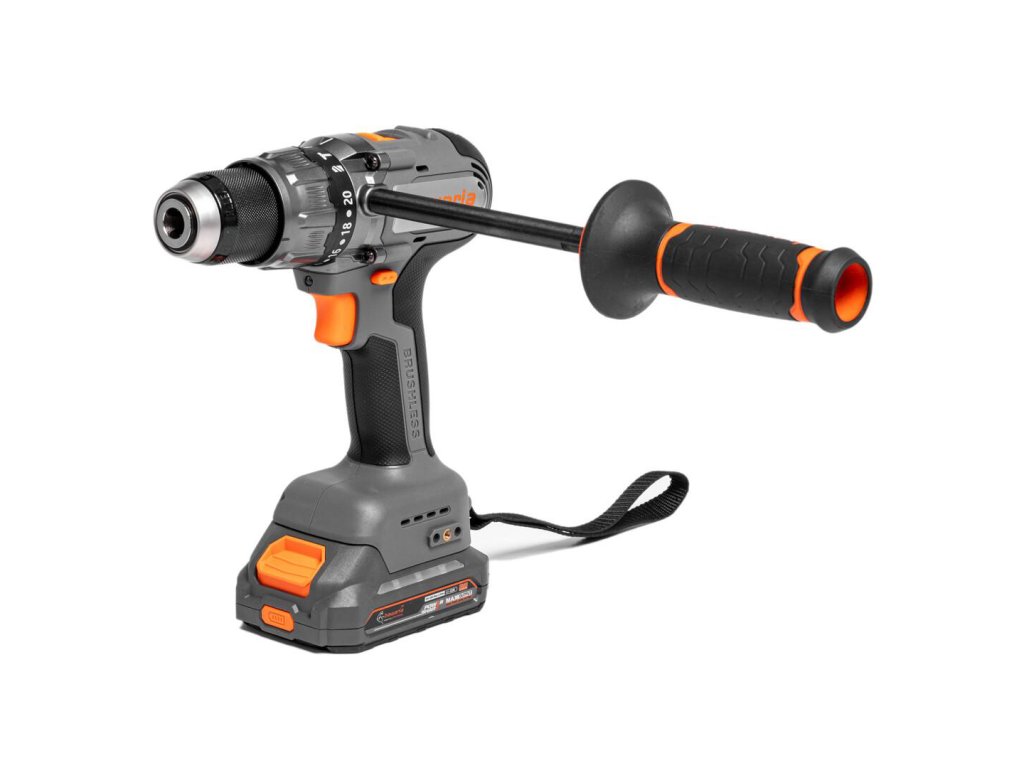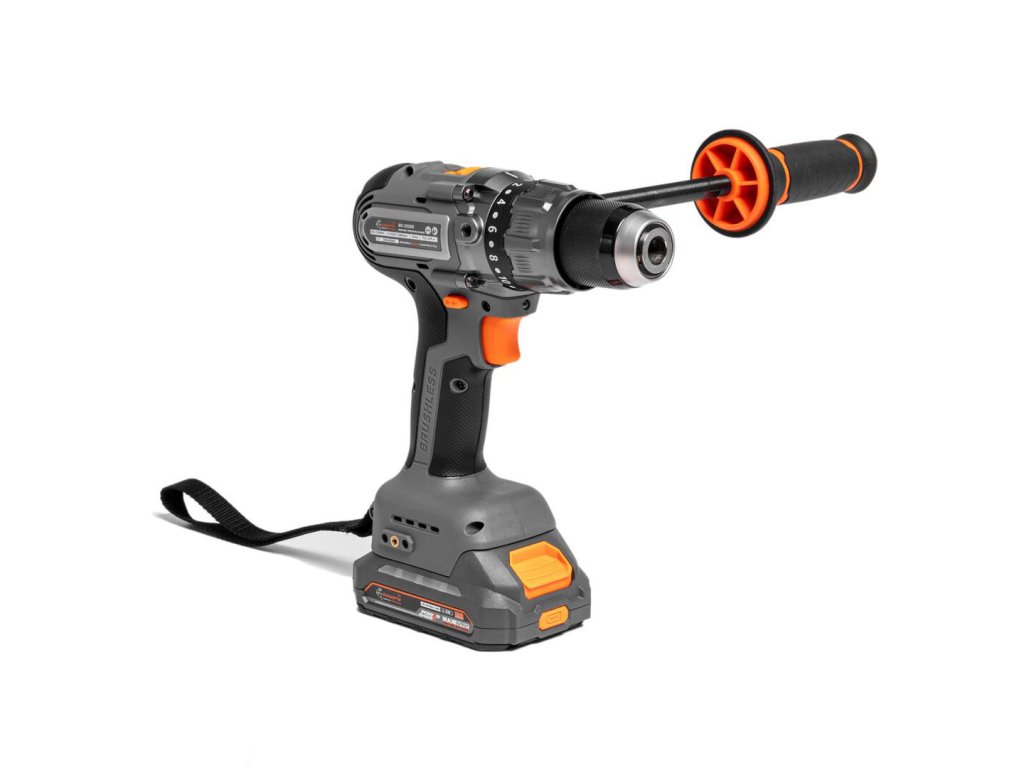 - Výkonná akumulátorová 2-rýchlostná príklepová vŕtačka napájaná 18V batériou