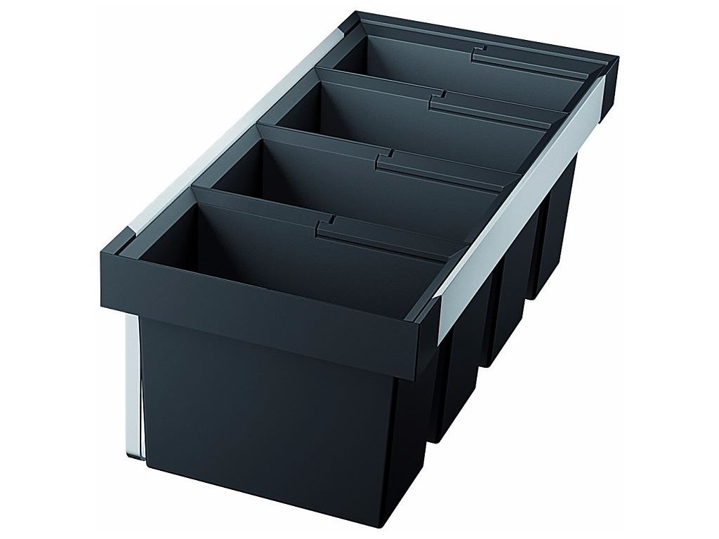 Moderný košový systém Blanco Flexon II 90/4 s 3 x 19 l a 1 x 16 l nádobami pre zabudovanie do spodných skriniek so zásuvkou šírky 90 cm. Každá nádoba je vybavená samostatným madlom a možno do nej vkladať sáčky na smeti. Tento pomocník Vám pomôže efektívne triediť domový odpad.