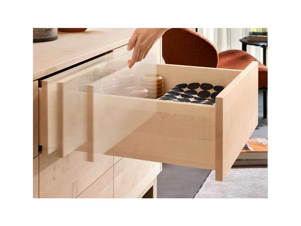 Skrytý celovýsuv TANDEM pre drevené zásuvky z materiálu s hrúbkou 11-16 mm s mäkkým dorazom pri otváraní a integrovanou funkciou TIP-ON, ktorá zabezpečuje mechanické otváranie. Plastové valčeky odolné proti opotrebovaniu zabezpečujú jednoduchú obsluhu. Nastavenie výšky bez použitia náradia pomocou spojky. Vyrovnanie bočných a hĺbkových tolerancií. Odporúčanie: Používajte synchronizačný hriadeľ na bezpečné spúšťanie nielen pre široké čelá.