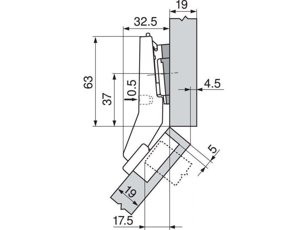 Blum 79A9658.T / Polonaložený záves CLIP top, uhol otvorenia 45° I, s pružinou, miska záv.: skrutkovanie, poniklované
