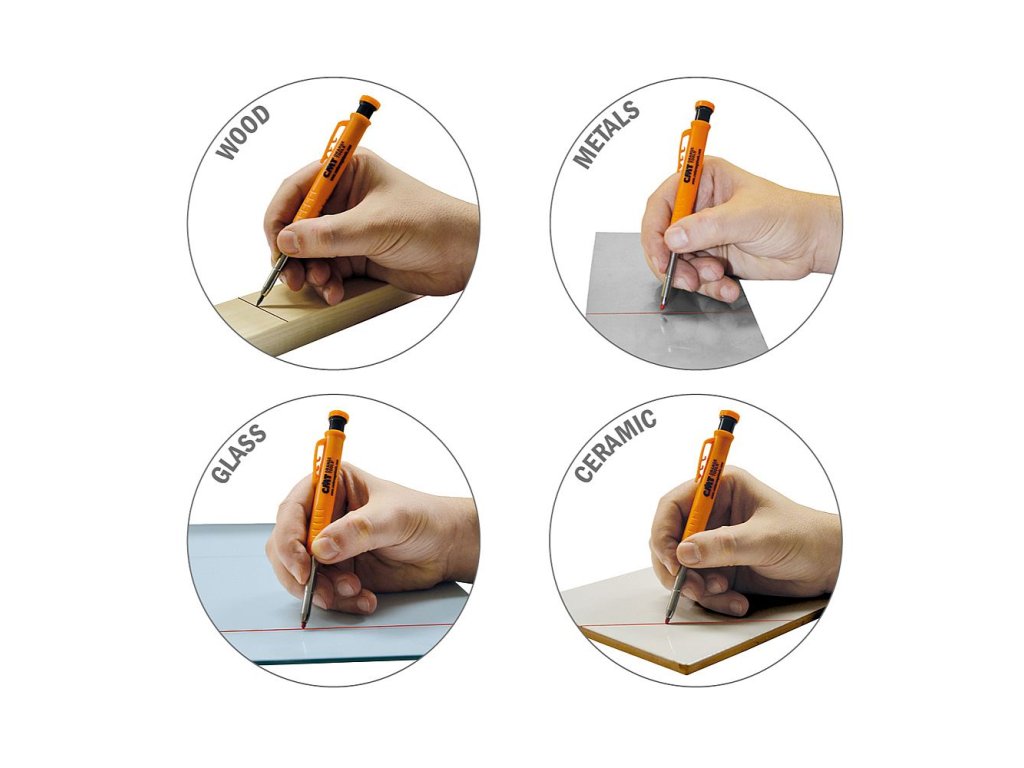 Všestranná značkovacia remeselnícka ceruzka má špeciálne vymeniteľné tuhy, ktoré umožňujú značenie na takmer všetky povrchy, bez ohľadu na to, či sú suché, mokré, drsné, hladké alebo zaprášené. Súčasťou balenia je jedna grafitová tuha.