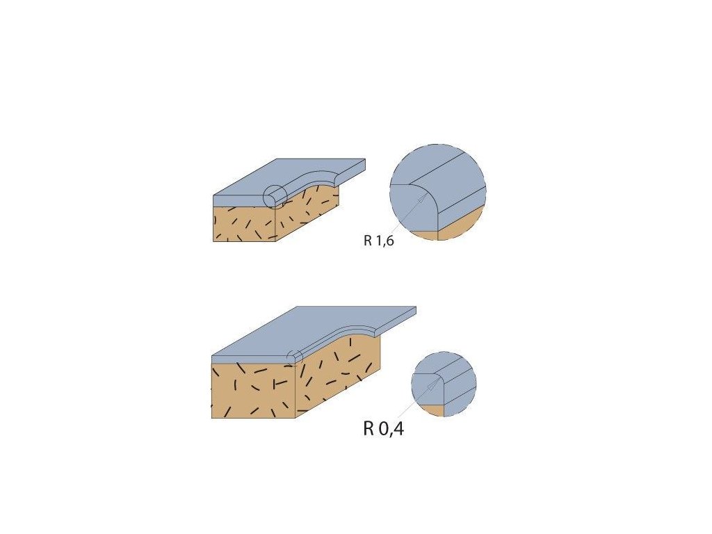 Táto nová CMT fréza je ideálna pre zaistenie hladkej hrany laminovaných povrchov po frézovanie. Ostré hrany sú mierne zaoblené rádiusom 0,4 mm alebo 1,6 mm. Povrch hrany je potom pekný a príjemný na dotyk. Nie je nutné žiadne ďalšie opracovanie.