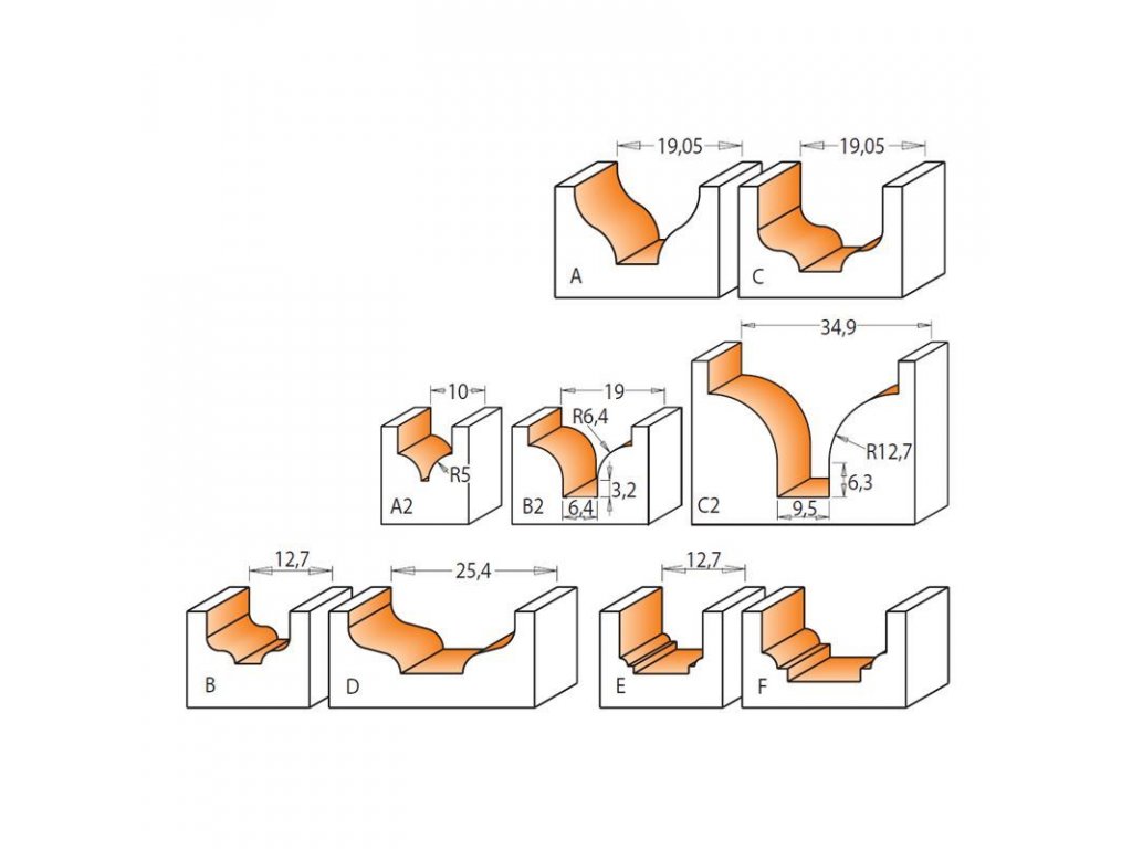 Široká ponuka profilových fréz CMT je určená pre výrobcov skriniek a nábytku. Dodávame 14 rôznych profilov na hrany stolov, obloženie dverí alebo okrasné lišty. Každá profilová fréza môže byť upravená pre výrobu profilov ľahkou výmenou ložiska. Pri výmene ložiska skontrolujte, či pravá strana čiernej podložky ložiska odpovedá otáčaniu ložiska. Nesprávna montáž môže spôsobiť vypadnutie skrutky.