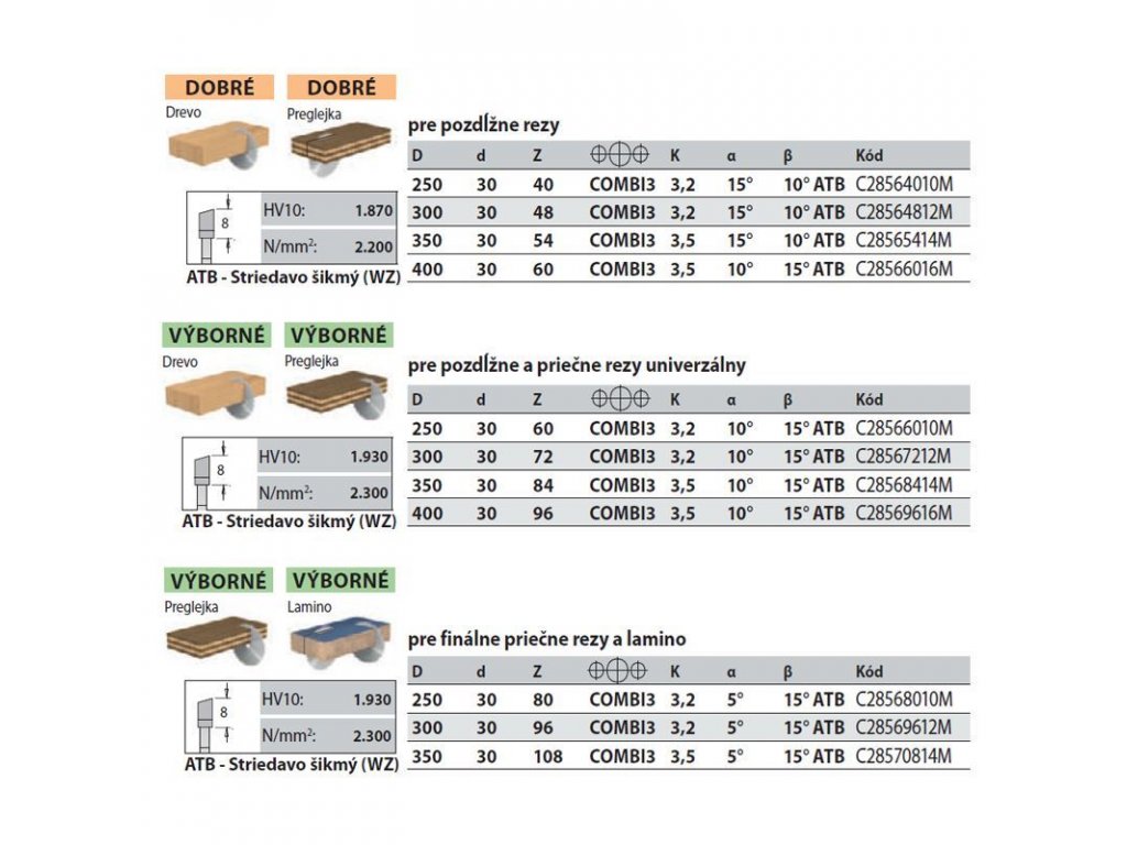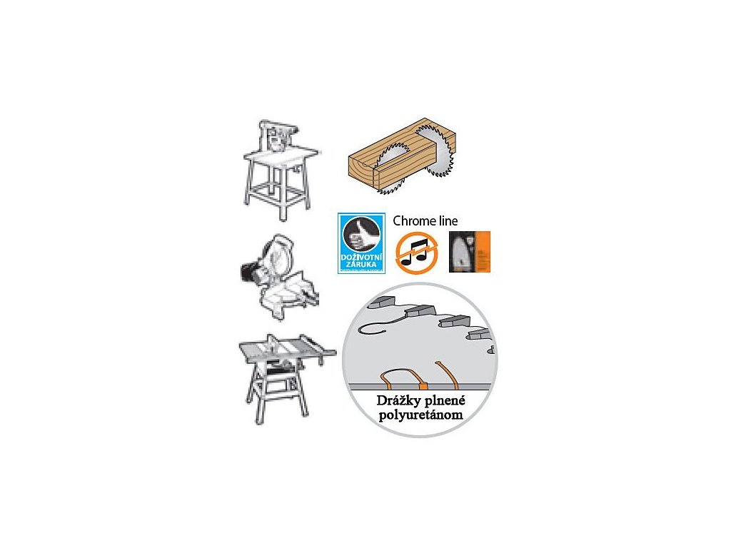 Pílový kotúč s chromovaným povrchom, ktorý redukuje prichytávanie zvyškov lepidla a živice na telo kotúča. Striedavo šikmé zuby z extra tvrdého tvrdokovu pre rezanie mäkkého a tvrdého dreva, preglejky, škárovky atď. Má tlmiace drážky vyplnené oranžovým polyuretánom pre zníženie vibrácií a hlučnosti. Vysoká životnosť.