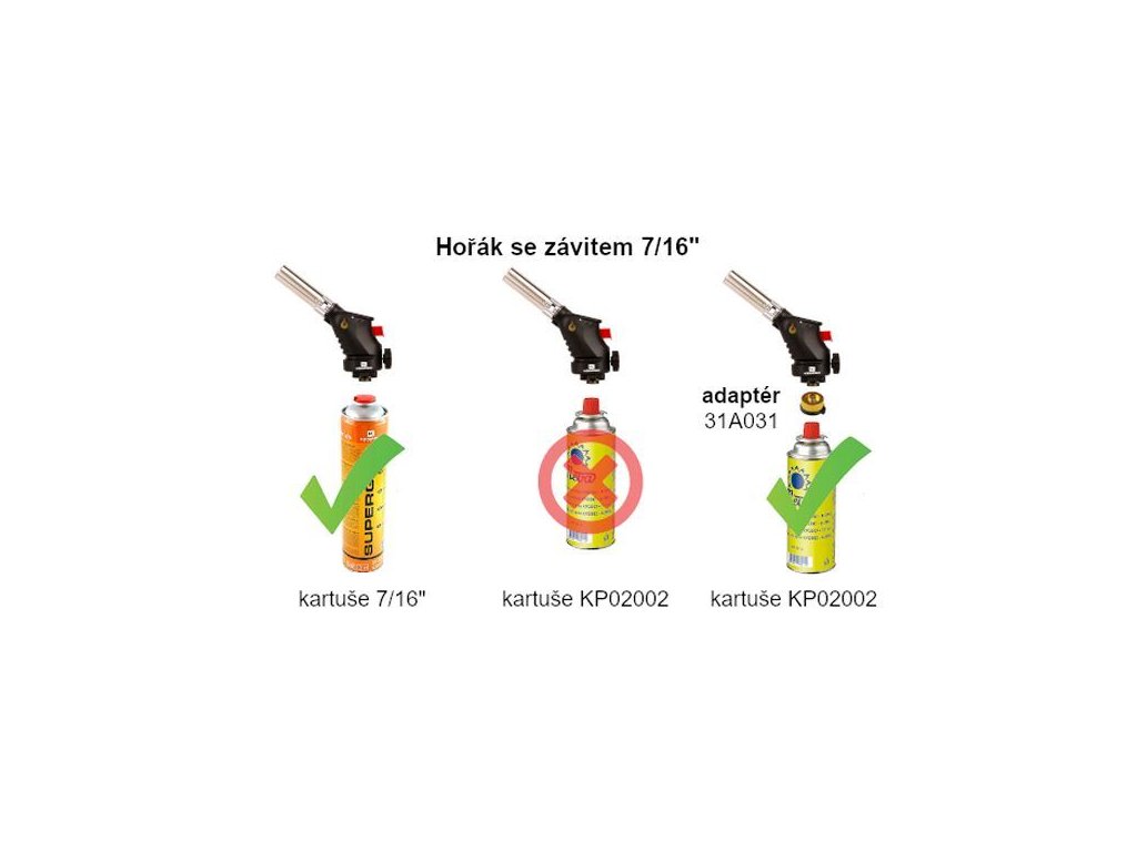 Adaptér Vám umožní pripojenie horákov so závitom EU 7/16" na podstatne lacnejšie ventilové kartuše typu CP250 / KP02002 / 227g. Adaptér naskrutkujte na horák a potom nasaďte kartušu.