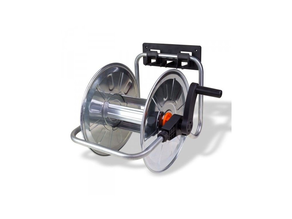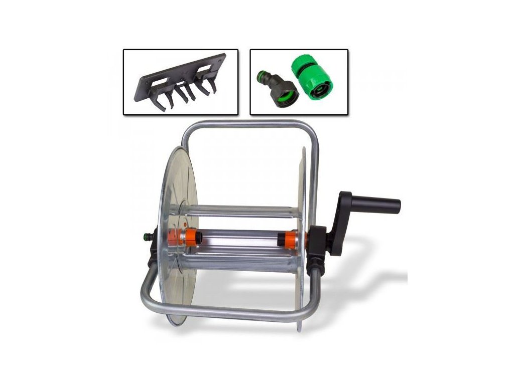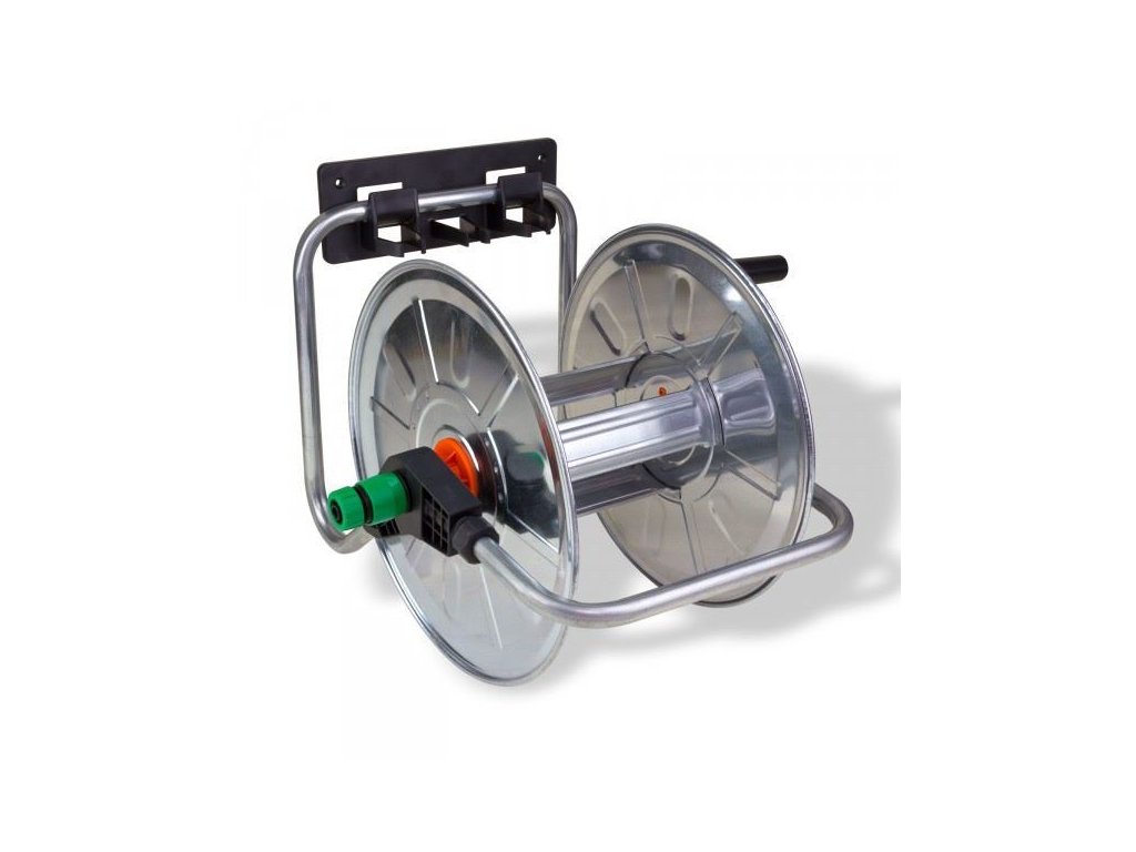 Navijak na hadicu z pozinkovaného kovu, ľahké navíjanie a odvíjanie pomocou PVC klzného ložiska, odnímateľný nástenný PVC držiak, 1 x rýchlospojka na vonkajšie a 1 x vsuvka pre vnútorné pripojenie.