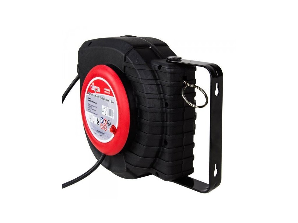 Automatický bubon s predlžovacím káblom 15 m. Každých 40 cm blokovanie západkou, uvoľnenie po opakovanom ťahu. Možnosť pripevnenia na stenu / na strop (vrátane pripevňovacích prostriedkov). Ochrana proti preťaženiu, 15 m dĺžka kábla HO5VV 3 x 1,5 mm2.