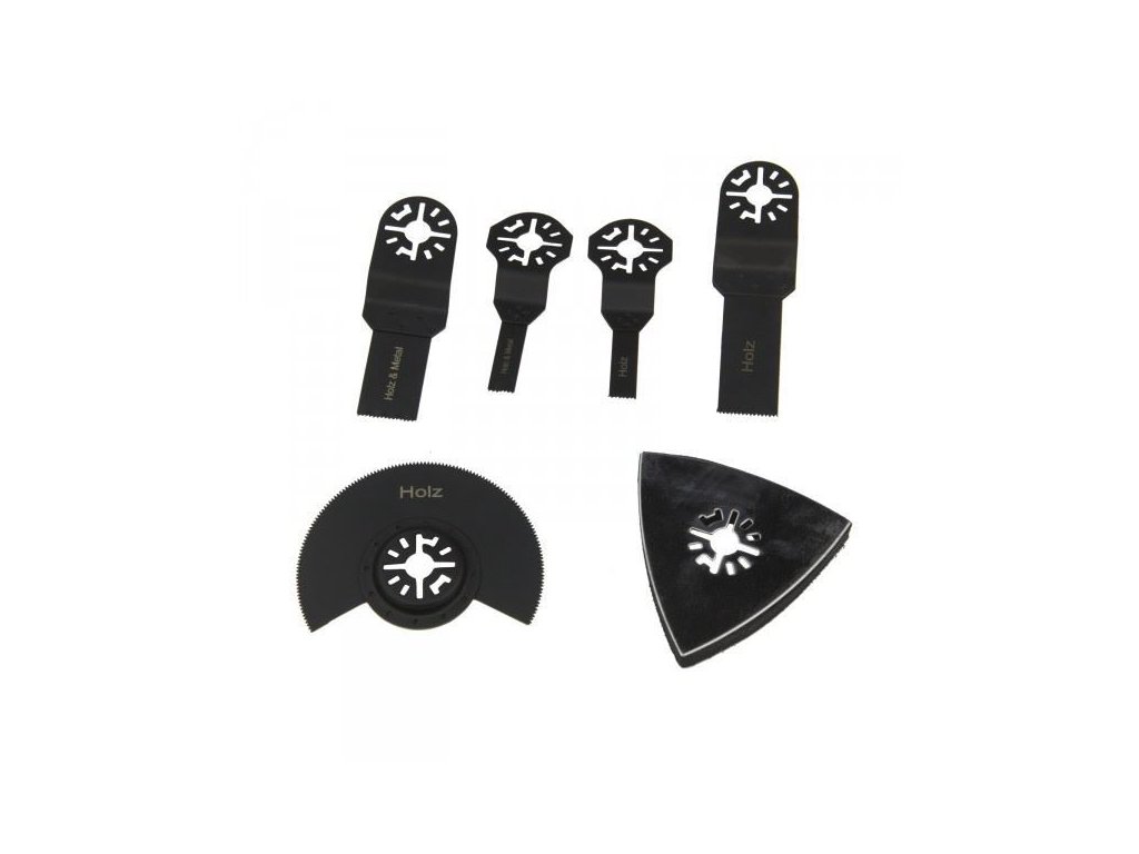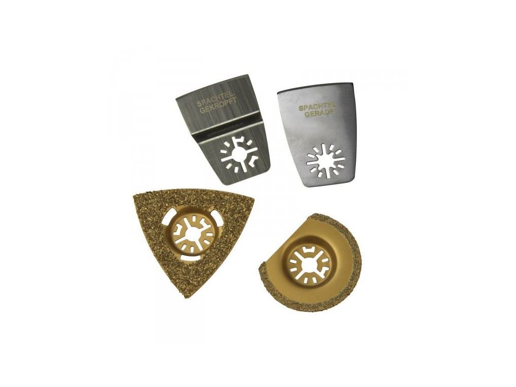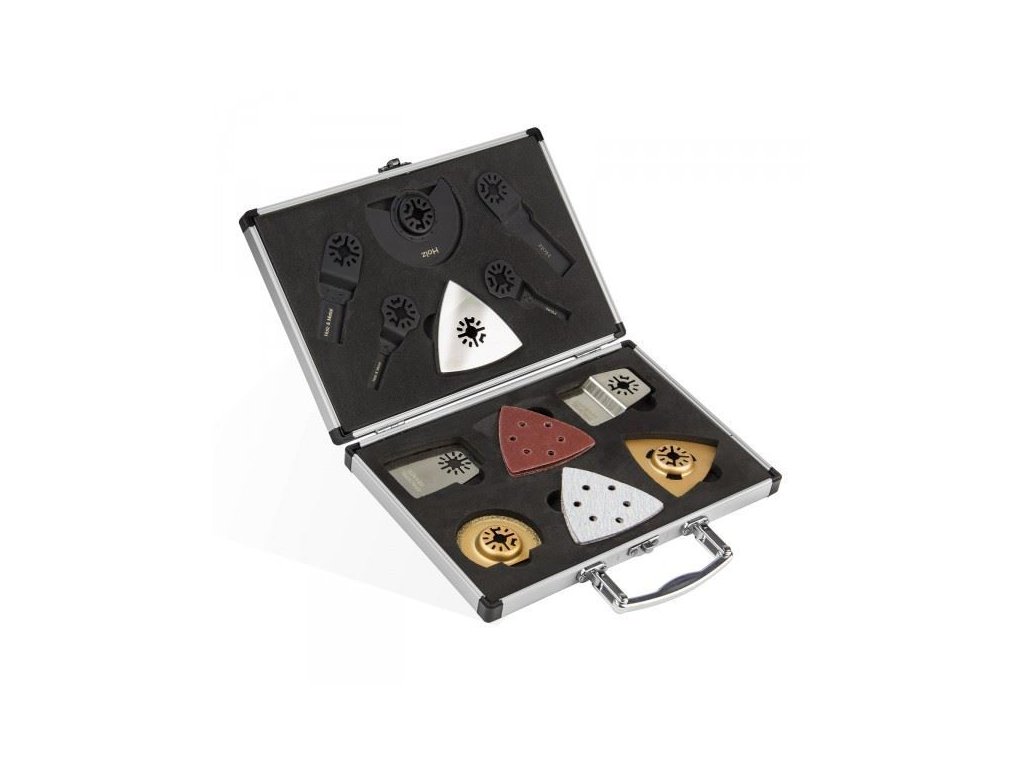 Sada náradia k multifunkčnému náradiu, príslušenstvo vhodné ku Multifunkčnému náradiu 3v1 180 W, 5 nástrojov (kód tovaru: 15057D). Upínanie 10 mm umožňuje použitie aj k náradiu iných značiek. Uložené v hliníkovom kufríku.