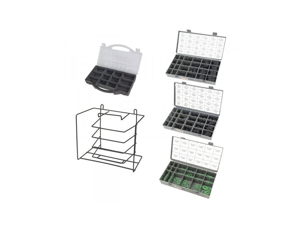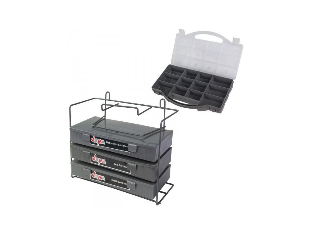 Kovový stojan s praktickými boxmi, 3 boxy naplnené - HNBR, SAE a metrický sortiment, 1 box prázdny, možnosť montáže na stenu, držadlo na prenášanie.