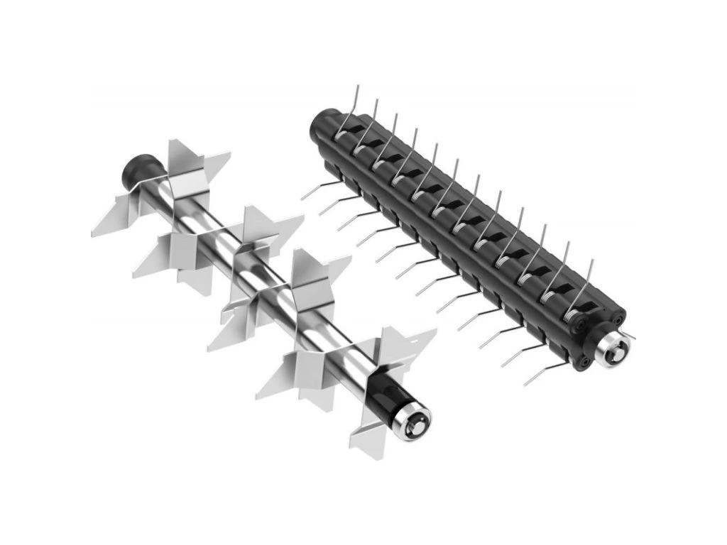 Elektrický vertikutátor a prevzdušňovač s bezpečnostným spínačom, sklopná vodiaca rukoväť, kolesá s ľahkým pojazdom, 4-polohové centrálne nastavenie výšky (-12 / -8 / -4 / +3 mm), odľahčenie kábla od ťahu. Nožový valec na vertikutáciu, prevzdušňovací valec.