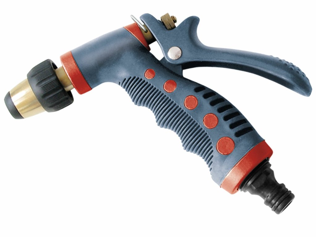 Záhradný kovový postrekovač má mosadzné telo a trysku s možnosťou nastavenia striekania do jemného vlhčenia až po silný prúd.