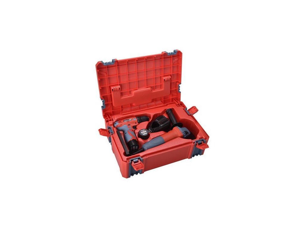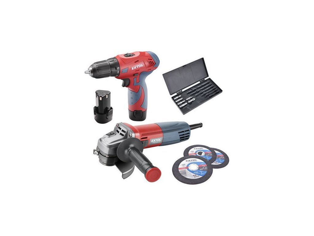Akčná sada obsahujúca najpopulárnejšie elektrické náradie – aku vŕtací skrutkovač a uhlovú brúsku. Ľahký výkonný dvojrýchlostný skrutkovač v ultra kompaktnej veľkosti je ideálny pre stredne ťažké vŕtanie a skrutkovanie do kovu a dreva. Malá, praktická brúska určená na ľahké rezacie a brúsne práce, obrusovanie zvarovacích švov a pod. Kompaktné rozmery umožňujú pohodlnú prácu jednou rukou. Celá sada je uložená v kvalitnom boxe, ktorý je kompatibilný s boxami Extol Premium. Súčasťou sady je taktiež puzdro s vrtákmi a bitmi a rezné kotúče.