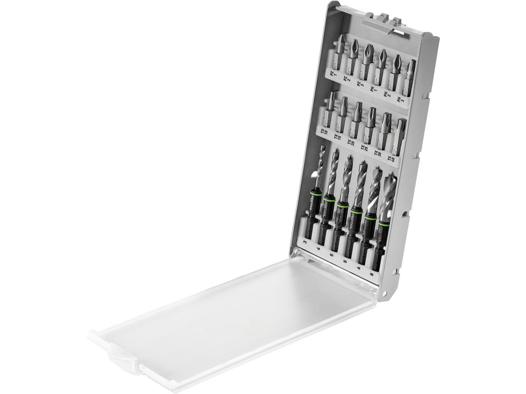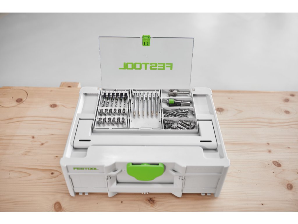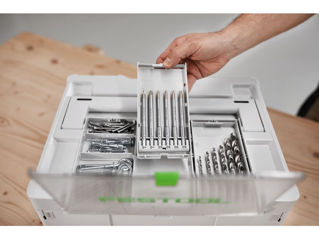 V praktickej kazete s priehradkami vo veku je vždy čisto uložených 12 vysokokvalitných skrutkovacích hrotov a 6 krátkych vrtákov do dreva, ktoré sú tak vždy rýchlo poruke. Kazetu so skrutkovacími hrotmi možno používať ako Systainer s priehradkou vo veku alebo ako samostatný box. Vďaka zabudovaným magnetom skrutkovacie hroty a vrtáky bezpečne držia na svojom mieste a možno ich pohodlne vybrať i odložiť. Vrtáky do dreva sa dajú priamo vložiť a zaistiť do skľučovadla na nástroje CENTROTEC. Malá dĺžka vrtákov uľahčuje manipuláciu s nimi, napríklad pri vŕtaní do dosiek alebo v úzkych priestoroch.