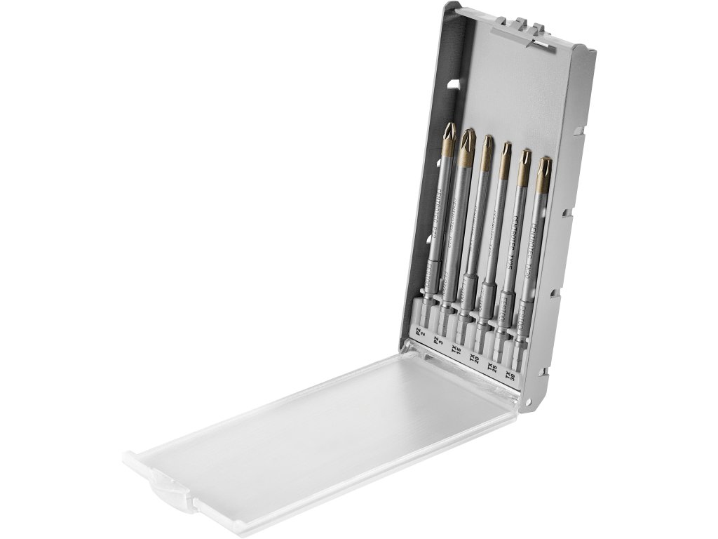V praktickej kazete s priehradkami vo veku je vždy čisto uložených 6 vysokokvalitných extra dlhých skrutkovacích hrotov, ktoré sú tak vždy rýchlo poruke. Kazetu so skrutkovacími hrotmi možno používať ako Systainer s priehradkou vo veku alebo ako samostatný box. Vďaka zabudovaným magnetom skrutkovacie hroty bezpečne držia na svojom mieste a možno ich pohodlne vybrať i odložiť. Extra dlhé skrutkovacie hroty možno vložiť a zaistiť priamo do skľučovadla na nástroje CENTROTEC. Konštrukčná dĺžka 100 mm uľahčuje skrutkovanie napríklad kovania a skrutkových spojov v otvoroch alebo v úzkych priestoroch.