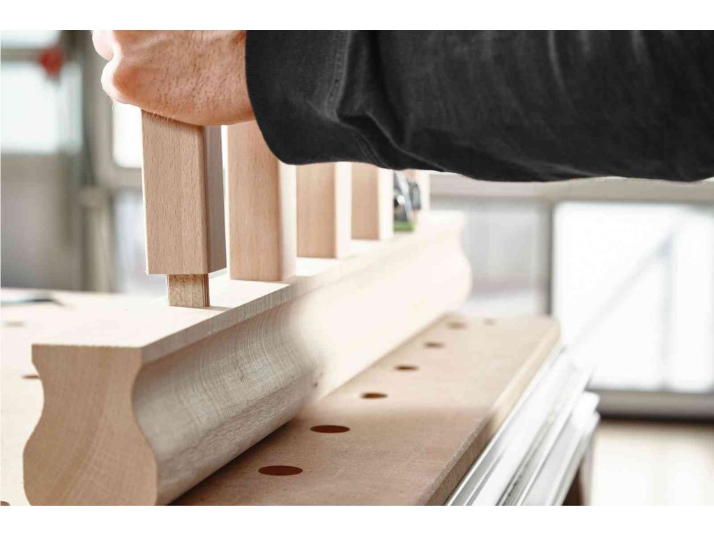 Zvláštny tvar v kombinácii s rozpínavými drážkami s lepidlom a pozdĺžnymi drážkami zabezpečí, aby kolíky bezpečne držali. Pre spojenie bez rizika prekrútenia a maximálnu stabilitu. A to pri výrazne rýchlejšom spracovaní: prvý otvor na kolík sa veľmi rýchlo vyrovná pomocou dorazov a presne vyfrézuje. Zafixuje spájané obrobky okamžite presne a zarovno s hranou. Systém DOMINO toleruje aj malé nepresnosti pri ďalších otvoroch na kolíky.