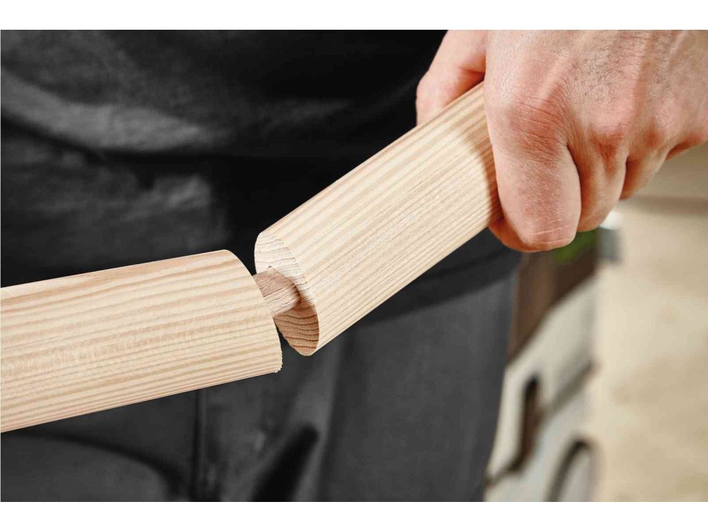 Zvláštny tvar v kombinácii s rozpínavými drážkami s lepidlom a pozdĺžnymi drážkami zabezpečí, aby kolíky bezpečne držali. Pre spojenie bez rizika prekrútenia a maximálnu stabilitu. A to pri výrazne rýchlejšom spracovaní: prvý otvor na kolík sa veľmi rýchlo vyrovná pomocou dorazov a presne vyfrézuje. Zafixuje spájané obrobky okamžite presne a zarovno s hranou. Systém DOMINO toleruje aj malé nepresnosti pri ďalších otvoroch na kolíky.