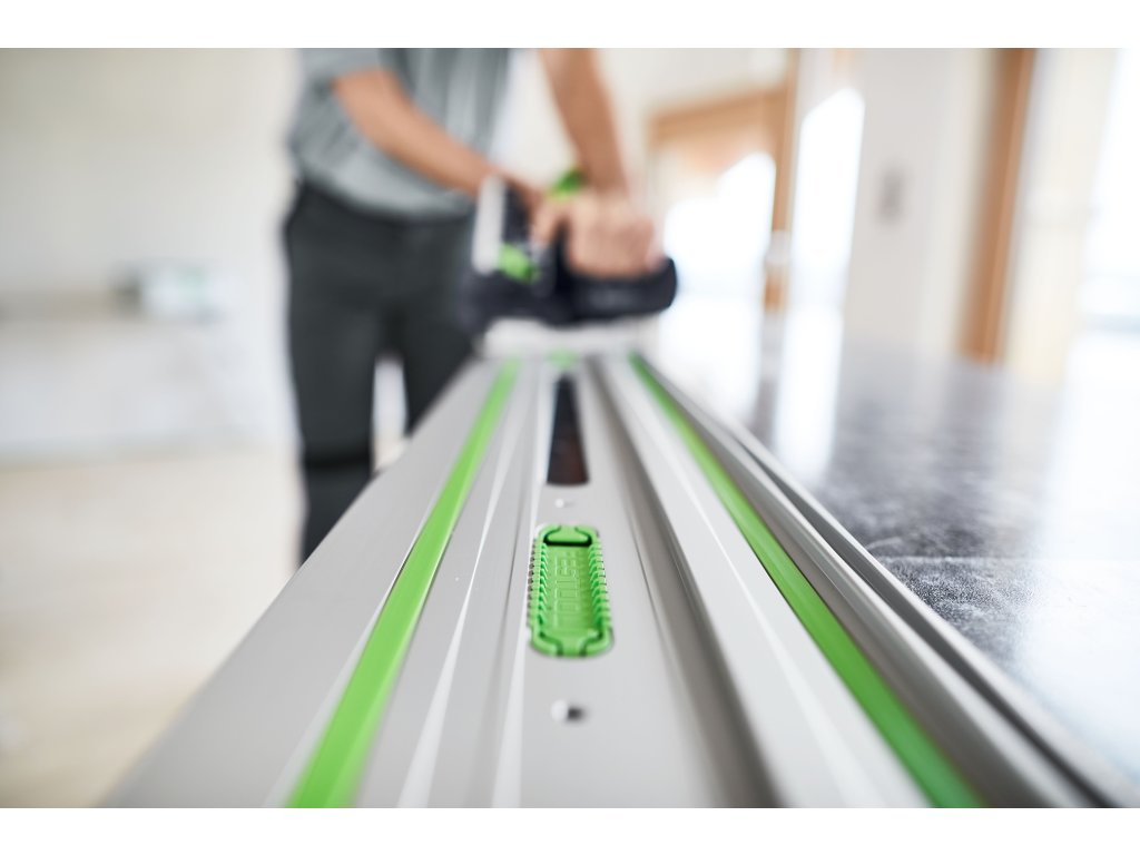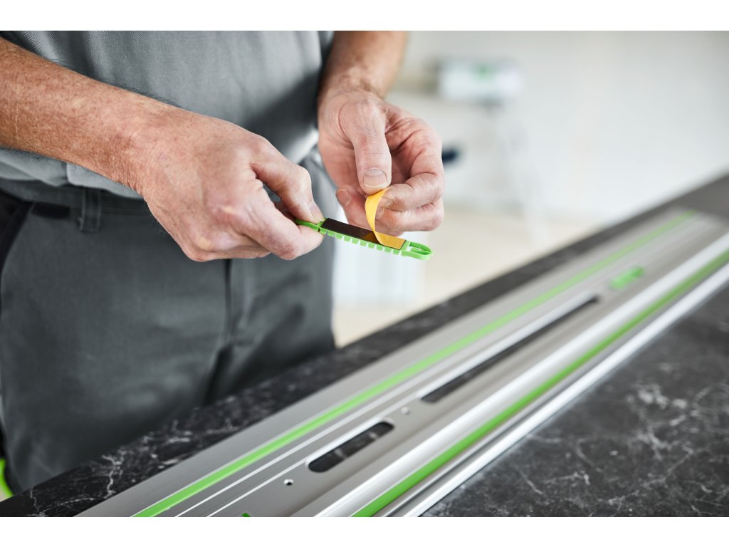Vyvinuté a zdokonalené v spoločnosti Festool: vodiaca lišta s lepiacimi podložkami. Na rovné a presné rezy pri horizontálnych prácach na podlahe alebo na pracovnej ploche, ale aj pri prácach na stene. Lepiace podložky umožňujú jednoduché upevnenie na rôznych povrchoch.