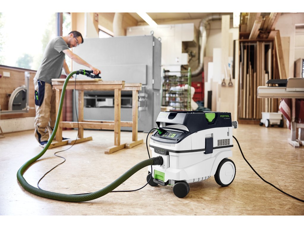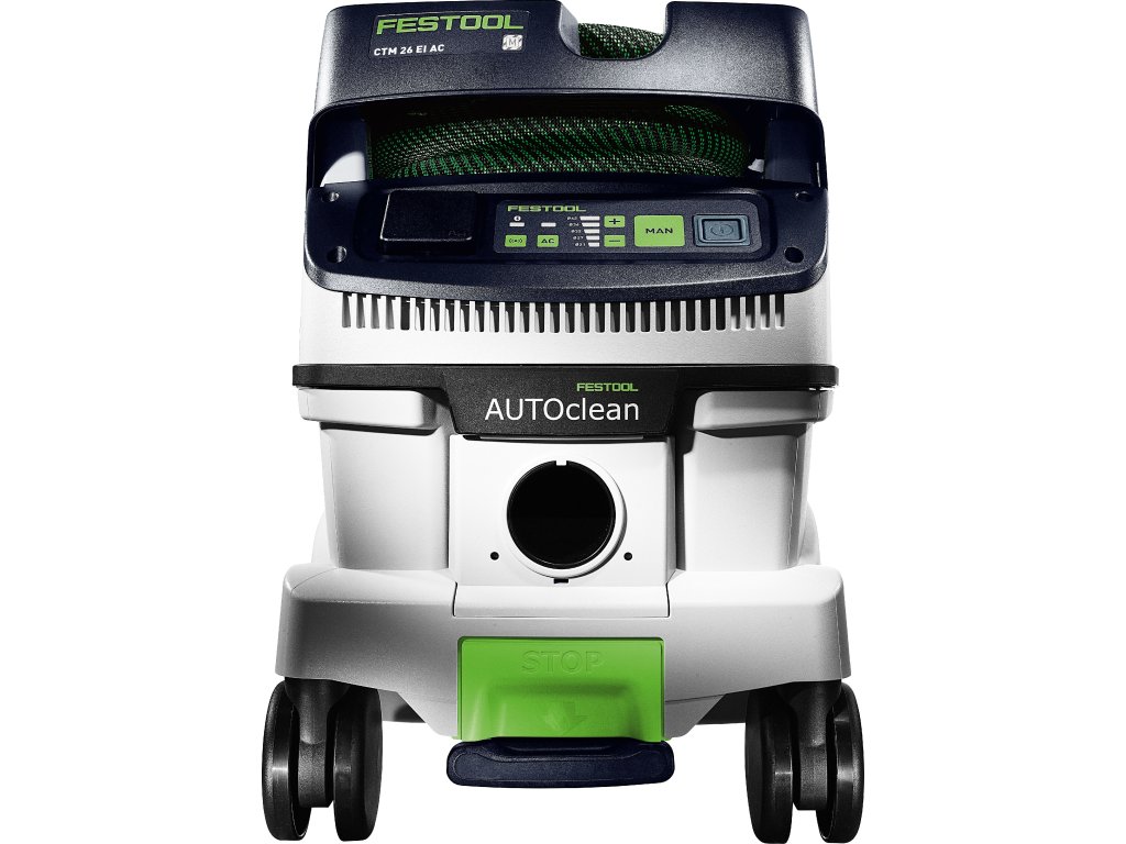 CLEANTEC CTM 26 EI AC sa vyznačuje, v porovnaní s predchodcom, efektívnejším čistením hlavného filtra AUTOCLEAN. To zabezpečuje konštantne vysoký sací výkon, dlhšie pracovné intervaly a dlhšiu životnosť filtra pri menších nárokoch na údržbu. Dotykové ovládanie umožňuje intuitívnu obsluhu tvojho vysávača. Zabudované rozhranie Bluetooth® umožňuje vysávač automaticky zapínať pomocou akumulátorového náradia Festool alebo pomocou voliteľného diaľkového ovládania. Ak je vysávač pripojený aj na aplikáciu Festool, možno tu napr. nastaviť intervaly čistenia. Hladkú, antistatickú saciu hadicu možno prakticky uložiť do zabudovaného držiaka hadice.