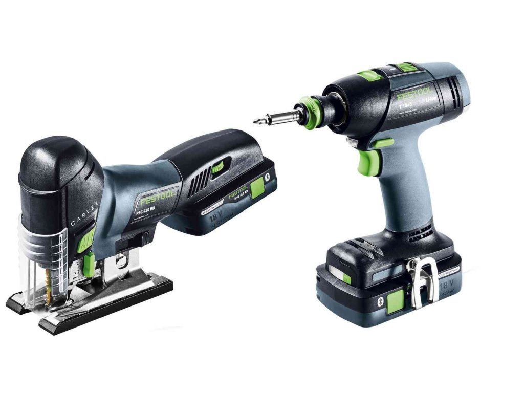Dvakrát 18 voltov. Dvakrát výkon ako zo zásuvky. Dvakrát s bezkefkovým, energeticky účinným motorom EC-TEC s dlhou životnosťou: akumulátorový vŕtací skrutkovač T 18+3 – silák s rozhodujúcim plus, čo sa týka účinnosti a výrazne vyšším krútiacim momentom. A akumulátorová priamočiara píla CARVEX PSC 420 – silný ťah a ľahká manévrovateľnosť pri rezaní oblúkov, v koncentrovanej a praktickej konštrukcii. O mimoriadne komfortné používanie CARVEX PSC 420 s mobilným vysávačom Festool sa postarajú akumulátory s Bluetooth®: V kombinácii s mobilným vysávačom Festool s funkciou Bluetooth® sa postarajú, aby sa vysávač automaticky zapol v režime AUTO vtedy, keď sa zapne akumulátorová priamočiara píla.