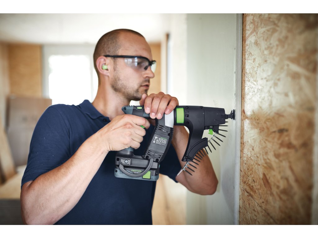 So zásobníkovým nadstavcom pre sadrokartónové/stavebné skrutkovače je možné spracovať pásové skrutky s dĺžkou 25 – 55 mm. Hĺbka skrutkovania sa dá ľahko nastaviť pomocou nastavovacieho kolieska, čo zabraňuje dorábkam a umožňuje presné skrutkové spojenia s enormným počtom cyklov.