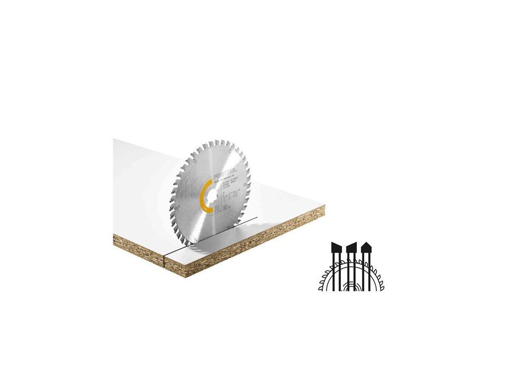 Optimálny pílový kotúč do okružnej píly pre jemné rezy. Pílový kotúč do okružnej píly s osadením zo spekaného karbidu so striedavými zubami (W) na čisté a hladké priečne rezy v masívnom dreve, v dyhovaných či povrchovo upravených doskách. Z kvalitnej ocele a zuby píly zo spekaného karbidu najjemnejšej zrnitosti.
