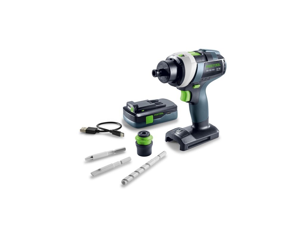 - vrát. odoberateľného akumulátora (nabíjanie cez kábel USB-C) s indikátorom stavu nabitia, univerzálne použiteľného pre všetky hračky Festool