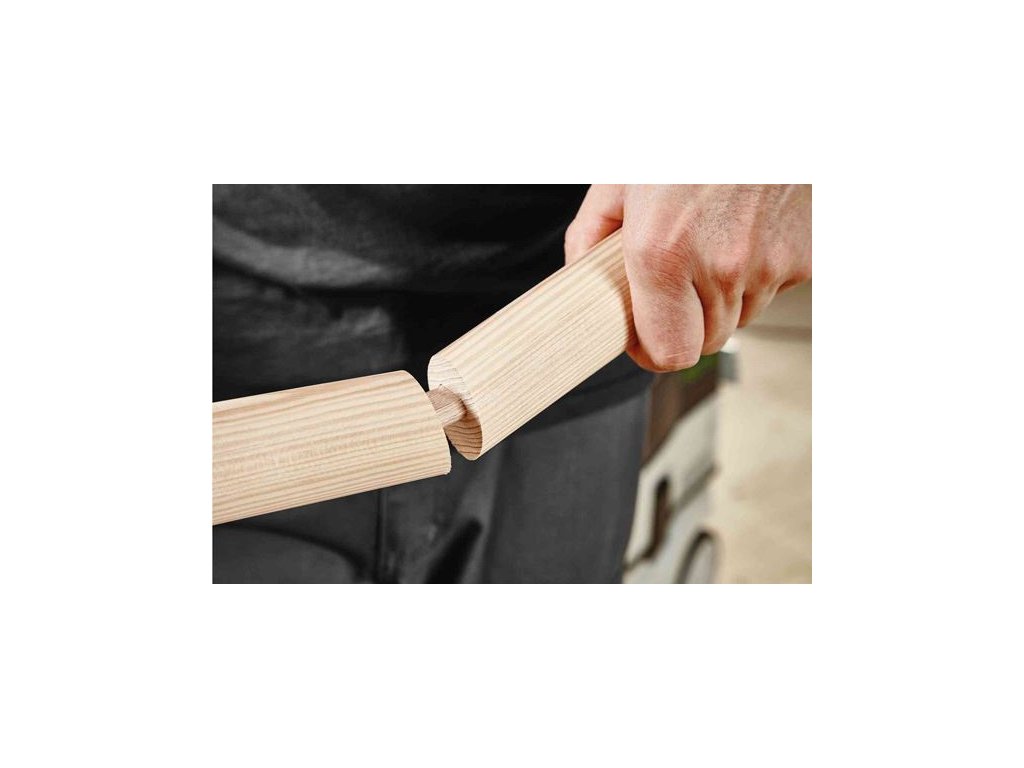 Zvláštny tvar v kombinácii s rozpínavými drážkami s lepidlom a pozdĺžnymi drážkami zabezpečí, aby kolíky bezpečne držali. Pre spojenie bez rizika prekrútenia a maximálnu stabilitu. A to pri výrazne rýchlejšom spracovaní: prvý otvor na kolík sa veľmi rýchlo vyrovná pomocou dorazov a presne vyfrézuje. Zafixuje spájané obrobky okamžite presne a zarovno s hranou. Systém DOMINO toleruje aj malé nepresnosti pri ďalších otvoroch na kolíky.