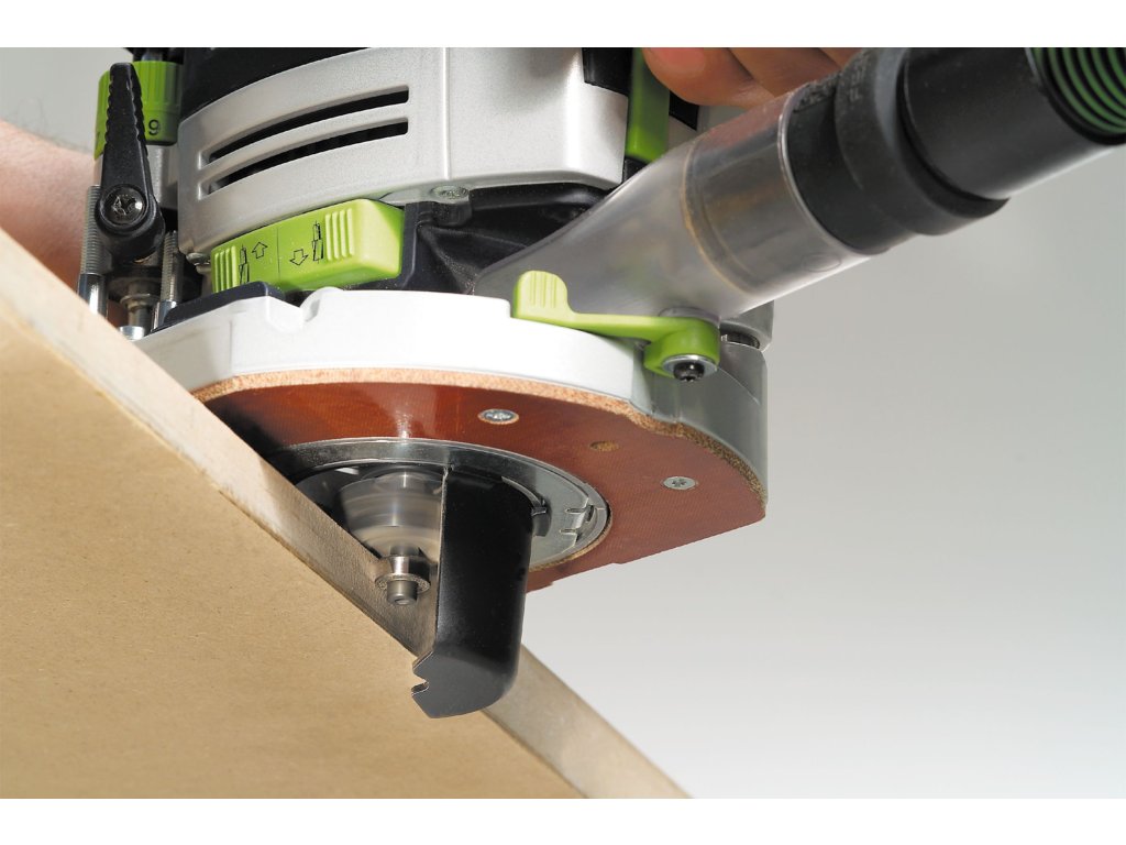 Pri frézovaní v oblasti hrany je horná frézka len do polovice na obrobku. Táto klzná pätka umožňuje bezpečné a stabilné dosadnutie hornej frézky.