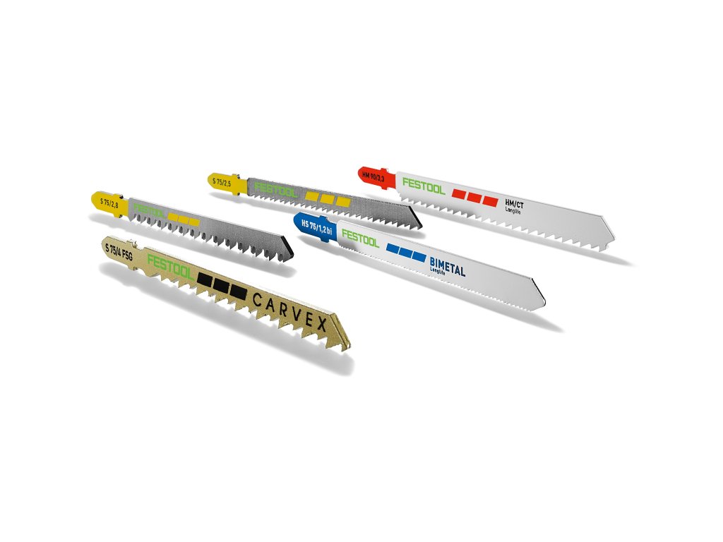 - S farebným označením Festool je možné rýchlo nájsť správny pílový list: žltá farba znamená opracovávanie dreva, červená opracovávanie plastov a modrá práca s kovom