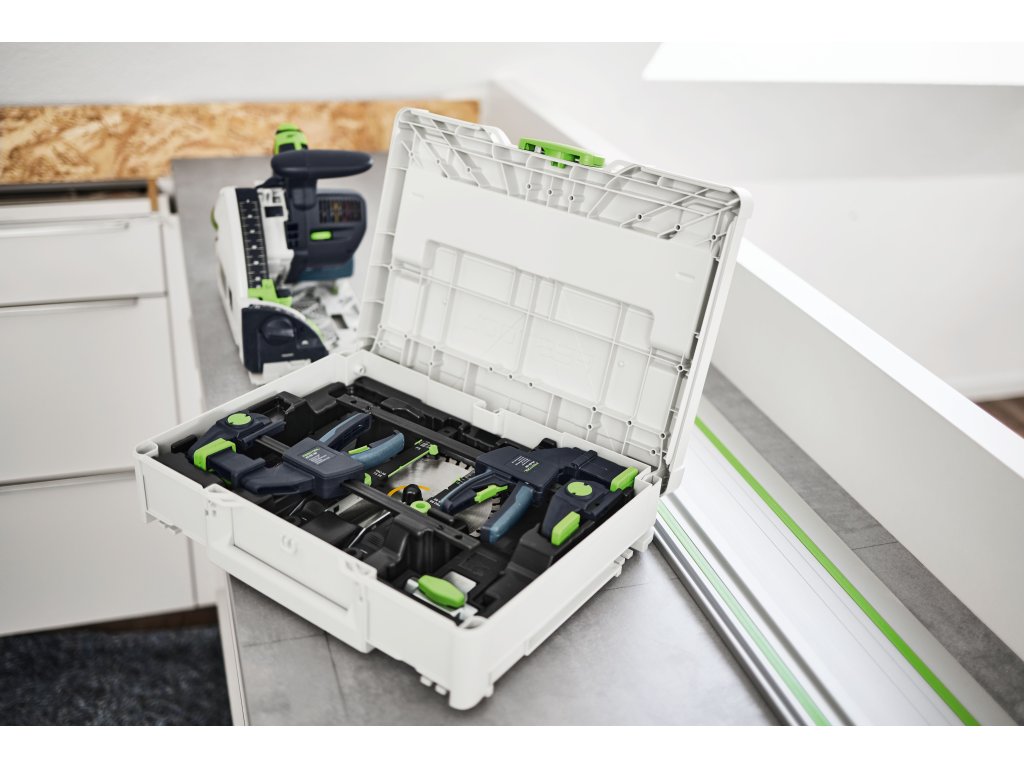 Táto súprava je perfektným doplnkom k vašej ponornej píle: Vďaka ukazovateľu polohy pri ponornom reze dokážete spoľahlivo trafiť presný vstupný a výstupný bod pílového kotúča pri akejkoľvek hĺbke rezu. Jednoducho ho vložte zhora do drážky vodiacej lišty a zaistite. Potom nastavte stupnicu ukazovateľa označenia na nastavenie hĺbky ponornej píly, zarovnajte ju s nárysom a výrezy realizujte presne tam, kde ich potrebujete. S príslušnými jednoručnými svorkami môžete vodiacu lištu upevniť na obrobok len jedným pohybom, aby ste mohli pracovať bezpečnejšie a kontrolovane. V kontajneri Systainer je miesto aj na pílové kotúče a spojky FS, aby ste mali systémové príslušenstvo vždy poruke.