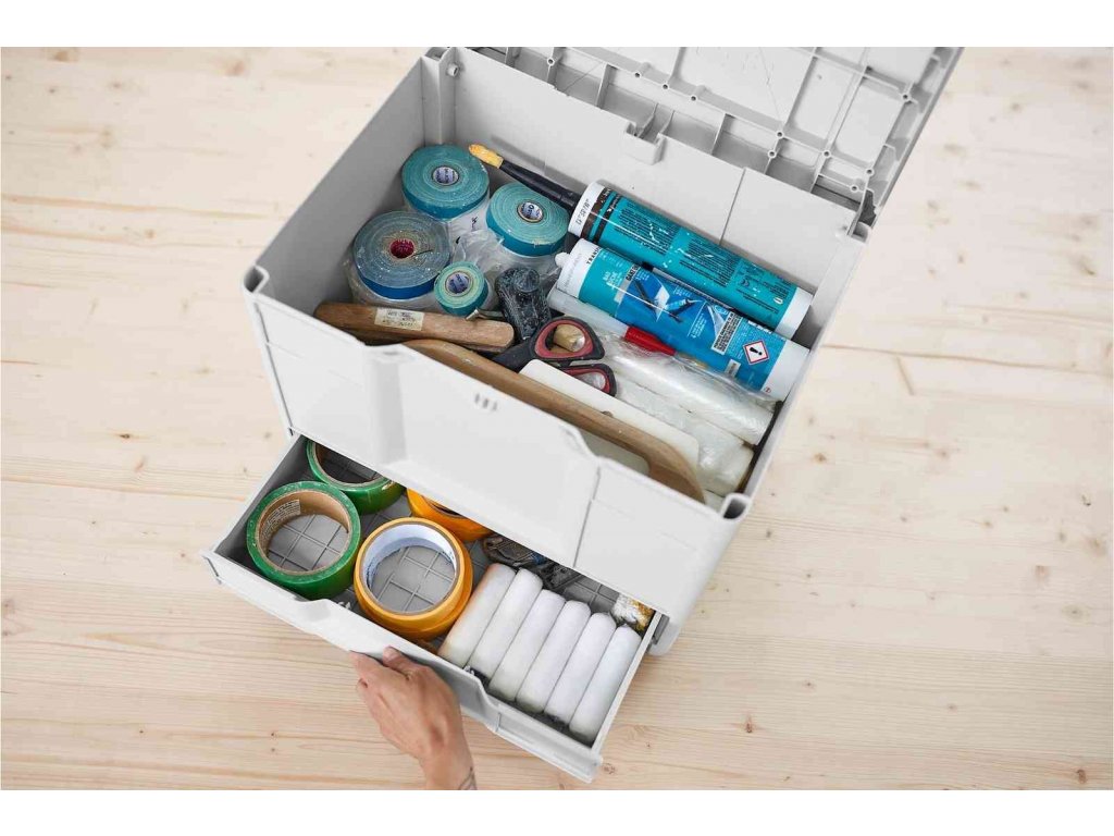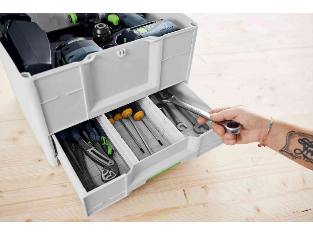Chytrá kombinácia Systainer³ a Sortainer³: v kontajneri Systainer³ Combi môžete prenášať vaše náradie a príslušenstvo spolu v jednom kontajneri Systainer. Hore máte miesto na bezpečné uskladnenie počas prepravy elektrického a ručného náradia; dola nájde svoje miesto vhodné príslušenstvo. Zásuvky si môžete individuálne rozdeliť pomocou priečok alebo samostatne dostupných vkladacích boxov – máte tak drobné diely, ako klince, kolíky alebo skrutky vždy prehľadne usporiadané. Všetko máte poruke – čo poskytuje väčší poriadok a úsporu času na pracovisku.