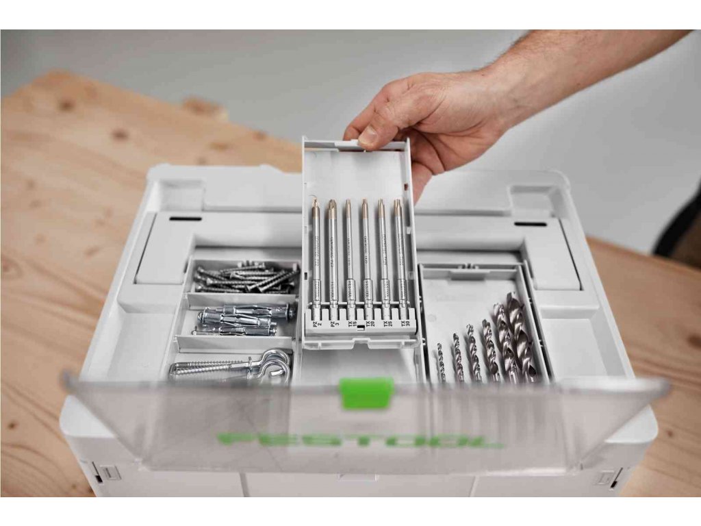 Usporiadane, prehľadne, rýchlo poruke: V kontajneri systému Systainer s priehradkou vo veku je vždy poruke vhodné príslušenstvo na každé použitie. Priehľadné veko umožňuje kedykoľvek rýchly prehľad. Rozdeľovače umožňujú rozdelenie priehradiek podľa vlastných potrieb – či pre dlhé vrtáky, pílové listy, skrutkovacie hroty alebo malé diely. Kompatibilné kazety skrutkovacích hrotov a vrtákov sa tiež perfektne zmestia do priehradky vo veku a dajú sa ľahko vybrať.