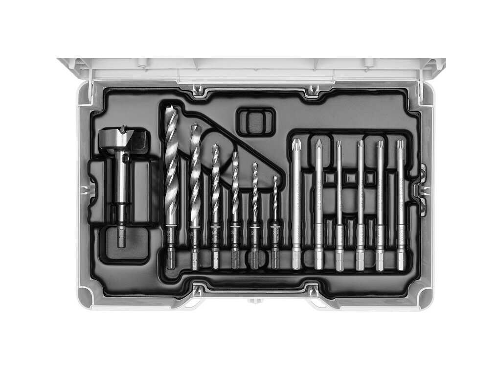 Najdôležitejšie príslušenstvo na vŕtanie a skrutkovanie máte poruke: bohatá súprava vrtákov a skrutkovacích hrotov pozostáva z kvalitných SDS vrtákov na vŕtanie do betónu. Na vŕtanie do dreva je v súprave špirálový vrták do dreva a 35 mm Forstnerov vrták. Na skrutkovanie sú v súprave k dispozícii aj skrutkovacie hroty s dĺžkou 100 mm. Vrtáky do dreva a Forstnerove vrtáky a tiež skrutkovacie hroty možno vložiť priamo do skľučovadla na nástroje CENTROTEC. Súprava príslušenstva je prehľadne a bezpečne uložená v praktickom MINI-Systaineri³ S. A aj na mobilné použitie: so stojanom Systainer³ Rack možno váš Systainer na príslušenstvo integrovať aj do zariadenia vozidla bott vario3.
