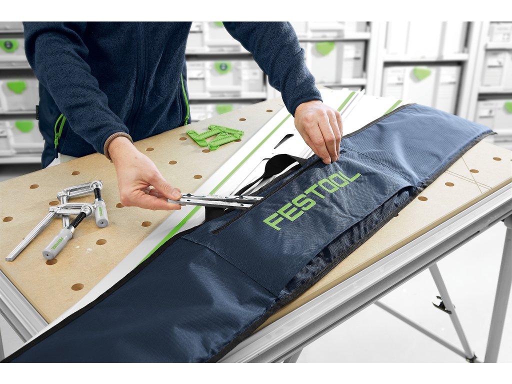 S taškou na vodiace lišty sú vodiace lišty dokonale chránené, prepravované a uložené. Taška má veľkú hlavnú priehradku, do ktorej sa zmestí jedna alebo dve vodiace lišty až do dĺžky 1 900 mm. Okrem toho je k dispozícii ďalšia taška, do ktorej sa zmestí príslušenstvo, ako sú spojky, skrutkové zvierky alebo uhlový doraz FS-WA/90°.