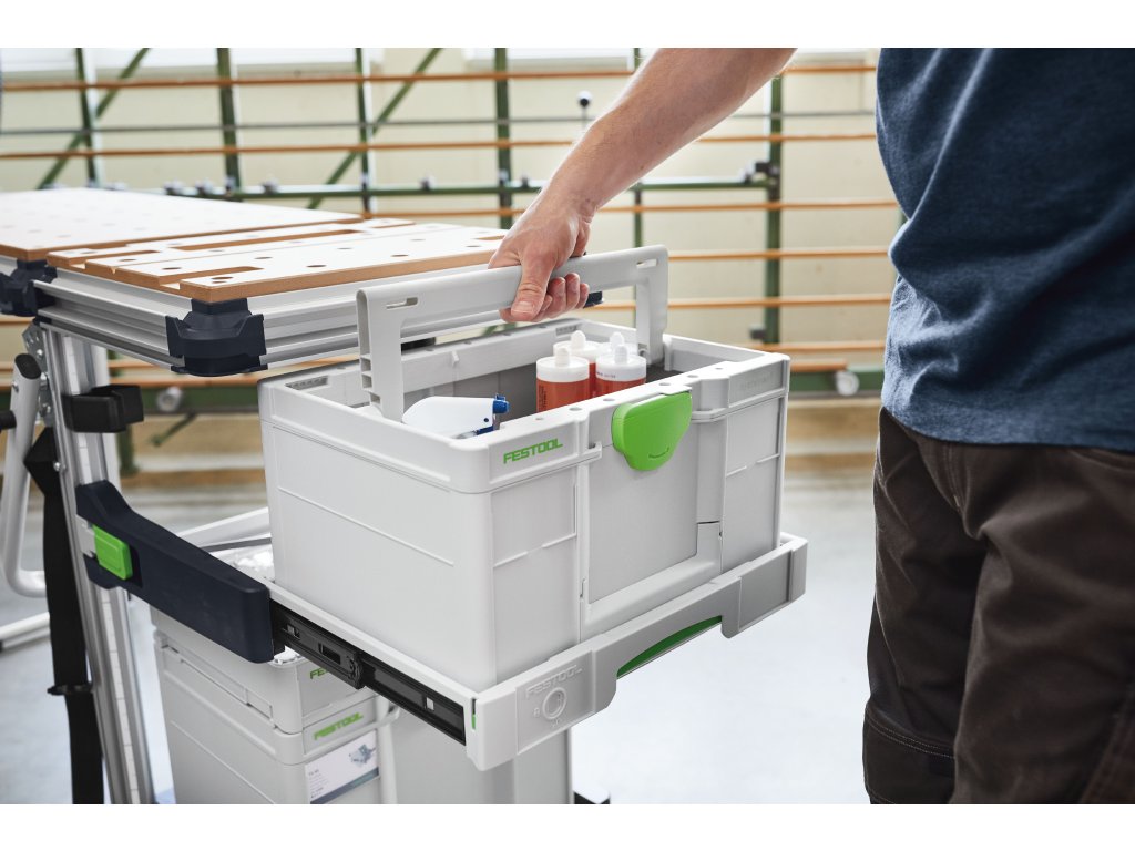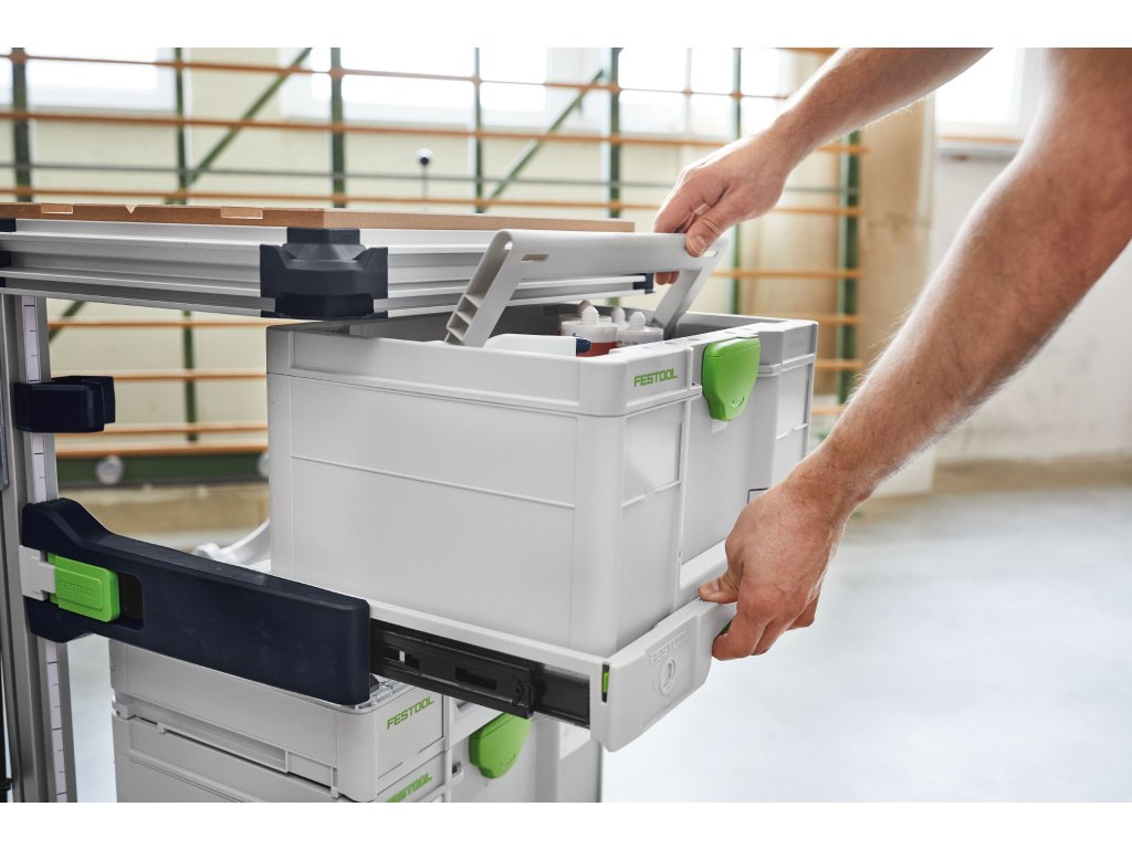 Rýchly prístup k stroju, náradiu a spotrebnému materiálu|Prvok na úplné vysúvanie, na úplné otvorenie krytu Systainera|Odoberacie dno slúži na odloženie SystainerOV – vďaka aretácii aj počas prepravy bezpečne uložené
