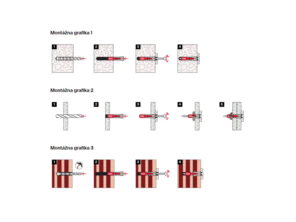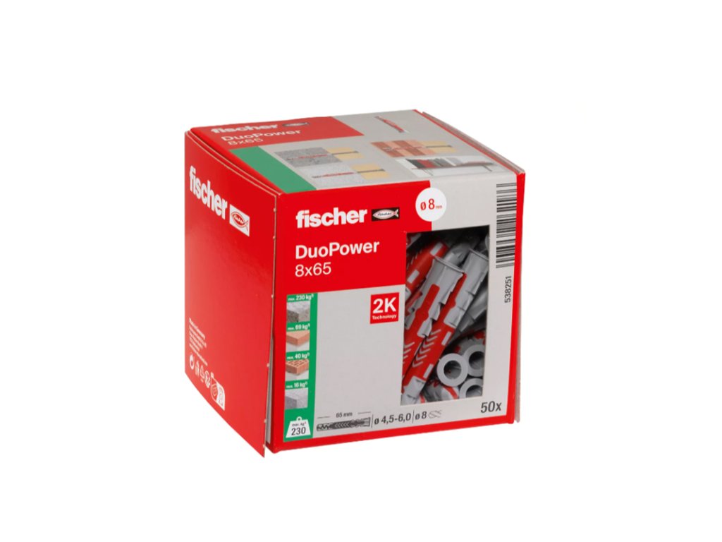 Pri použití hmoždinky DuoPower môžete počítať s naozaj výnimočnou únosnosťou. Kombinácia dvoch materiálov rôznych vlastností je cestou nie len ku maximálnemu zaťaženiu, ale aj ku samostatnej voľbe princípu fungovanie hmoždinky podľa toho, v akom stavebnom materiály je práve montovaná - či sa sklopí, rozoprie alebo zauzluje. Rozperné krídelká červenej časti napomáhajú správnej funkcií šedej, tuhšej časti hmoždinky. Skrutka sa ľahko skrutkuje, ale pri doťahovaní cítite, ako hmoždinka dobre ťahá a golier zabraňuje hmoždinke v zapadnutí do vyvŕtaného otvoru.