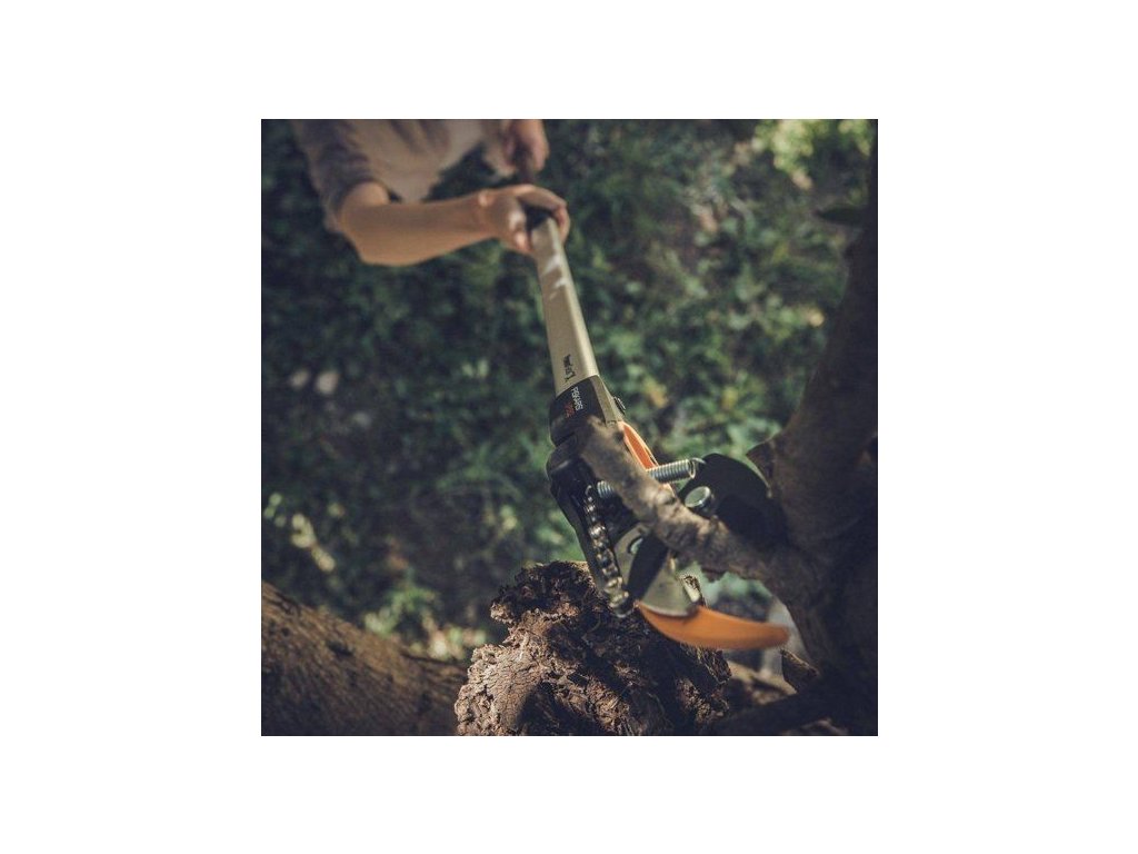 Nastaviteľná hlava nožníc a jednoduchý strižný mechanizmus zaisťujú rýchle a bezpečné strihanie vetiev z veľkej vzdialenosti.