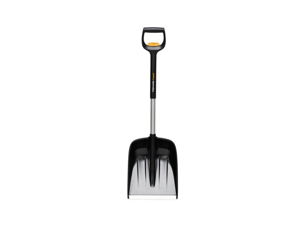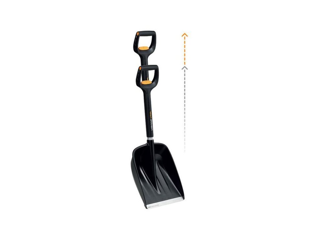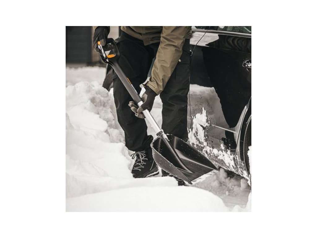 - Teleskopická lopata na sneh do auta X-series™ Fiskars má nastaviteľnú násadu, vďaka čomu predstavuje efektívny a ergonomický nástroj na odpratávanie snehu okolo auta