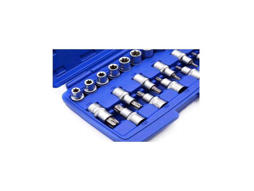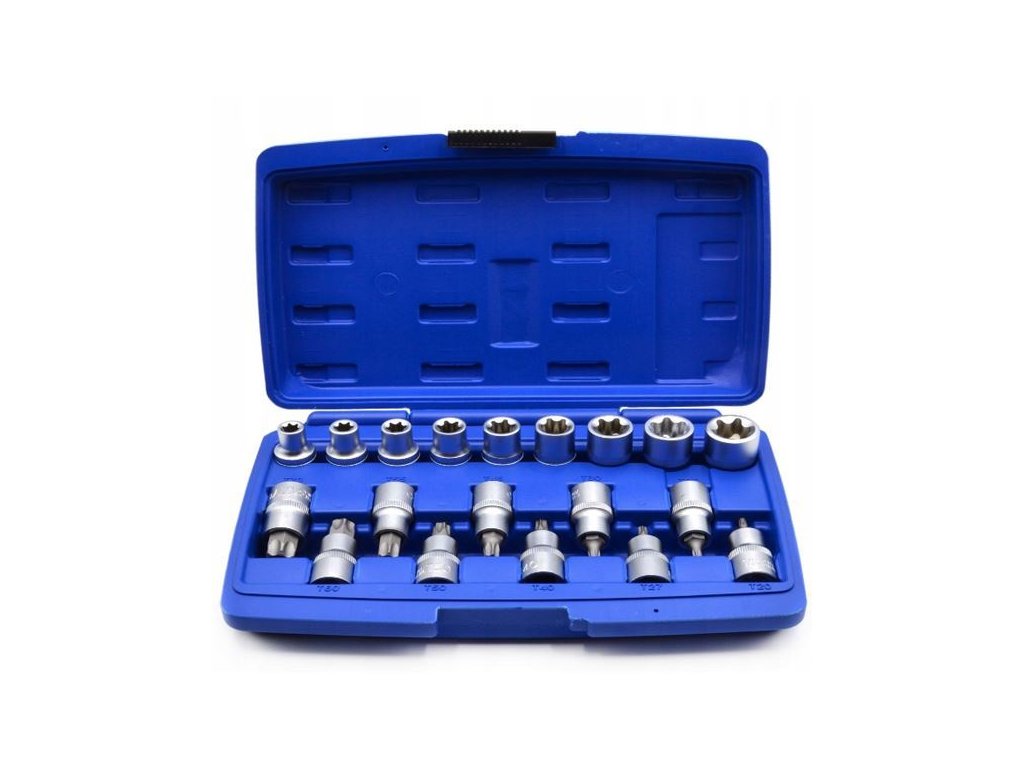 Sada hlavíc a bitov TORX, 19 prvkov. Bity a hlavice sú vyrobené z chróm-vanádiovej ocele.