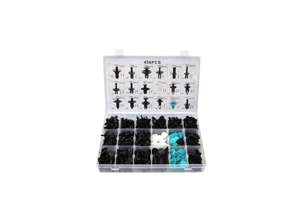 Veľká sada klipov, hmoždiniek a montážnych kolíkov používaných vo všetkých najpopulárnejších značkách automobilov. Sada obsahuje 456 kusov.