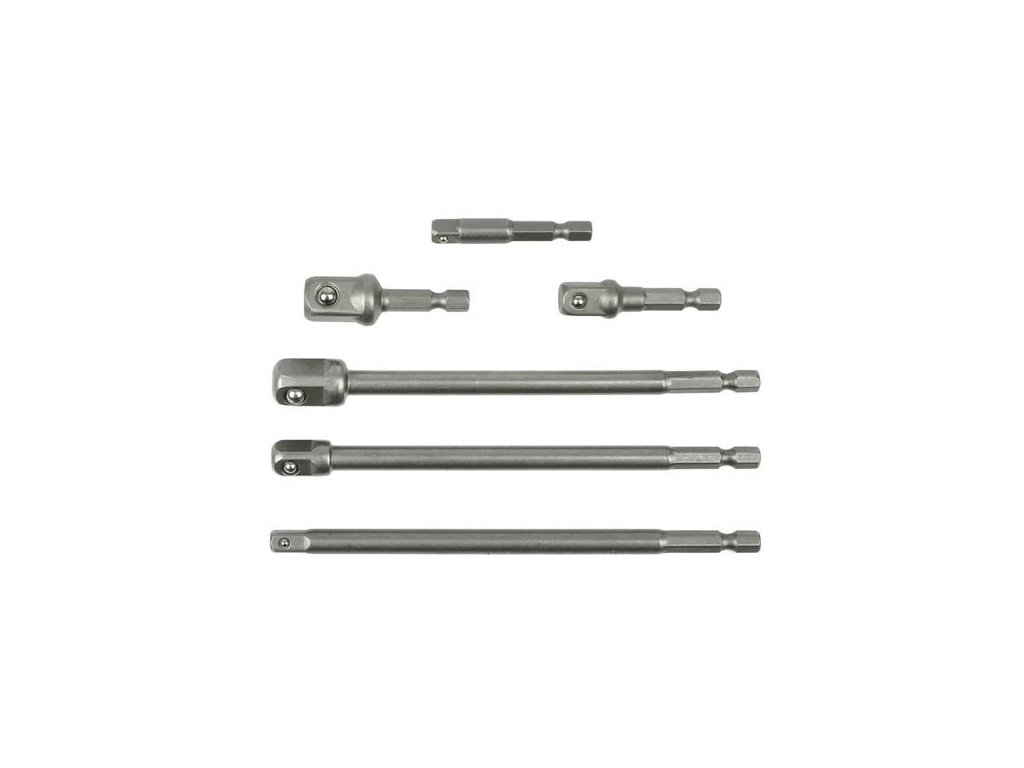 Sada obsahuje adaptéry s dĺžkami 150 mm a 50 mm pre 1/4", 3/8", 1/2" hlavice . Vyrobené z chróm-vanádiovej (CrV) nástrojovej ocele, s 1/4” HEX upínaním.