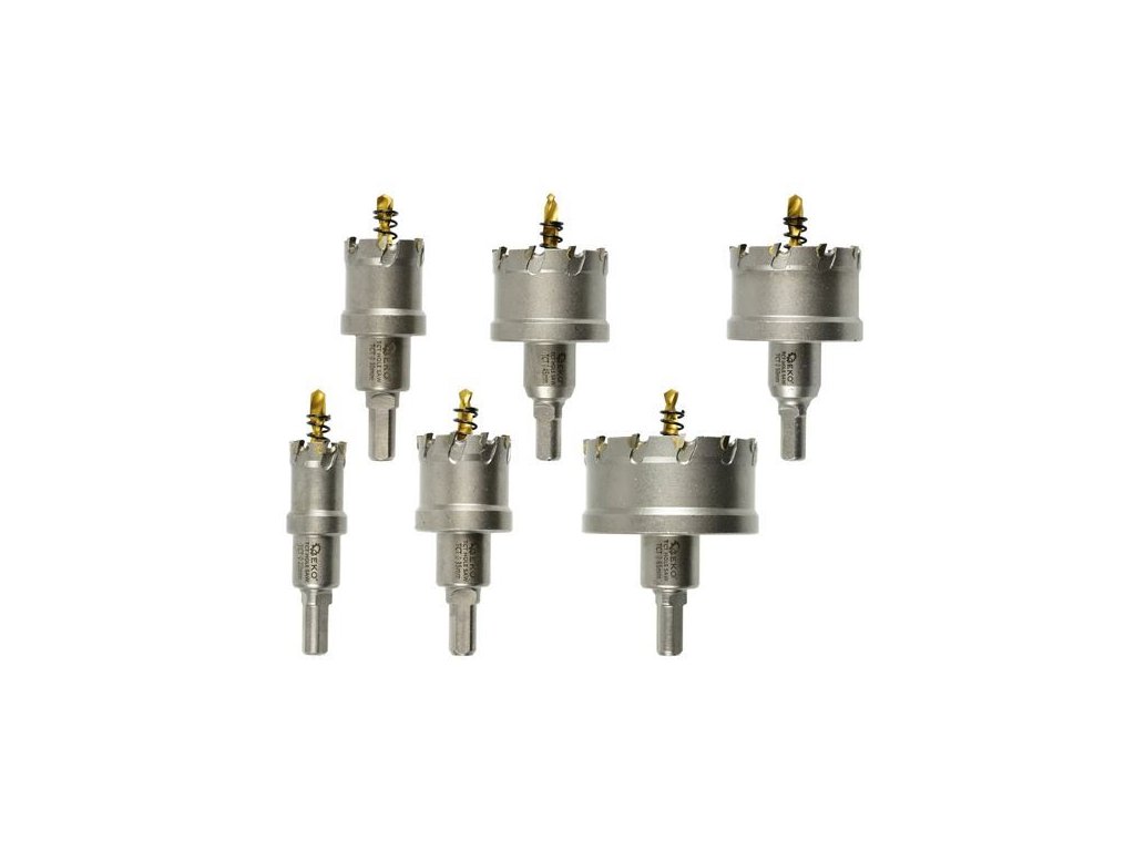 Sada 6 TCT dierových píl na kov vo veľkostiach 22-65 mm. Čepele sú vyrobené zo spekaných karbidov, ktoré sa vyznačujú oveľa väčšou tvrdosťou a odolnosťou voči vysokým teplotám v porovnaní s rýchloreznou oceľou HSS. Určené na vytváranie otvorov s väčším priemerom do ocele, liatiny, neželezných kovov, dreva, plastov atď. Na zvýšenie presnosti rezu bol použitý vodiaci vrták HSS. Na predĺženie životnosti dierových píl sa odporúča použitie chladiaceho maziva.