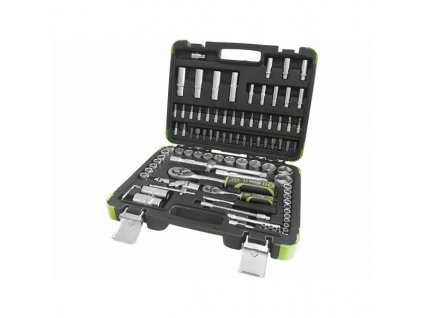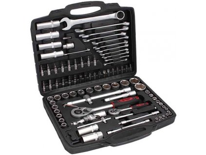 PH2, T8; 10; 15; 20; 25; 30, ploché 4; 5,5; 7 mm, pružný predlžovací nadstavec 150 mm 2 ks pevný predlžovací nadstavec 50 a 100 mm račňa nástrčná rukoväť posuvný „T“ kus a bitový adapter SQ1 / 4 HEX1 / 4. 1 / 2 "sada: 18 ks nástrčkových kľúčov 10; 11; 12; 13; 14; 15; 16; 17; 18; 19; 20; 21; 22; 23; 24; 27; 30; 32 mm, 4 ks dlhé nástrčkových kľúčov 14; 15; 17; 19 mm, 15 ks nástrčkových bitov: HEX 8; 10; 12; 14 mm