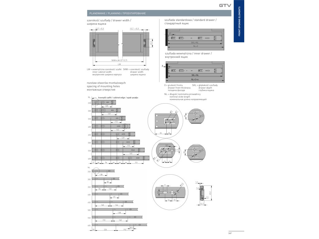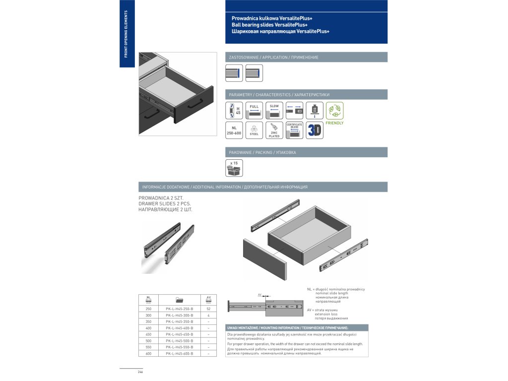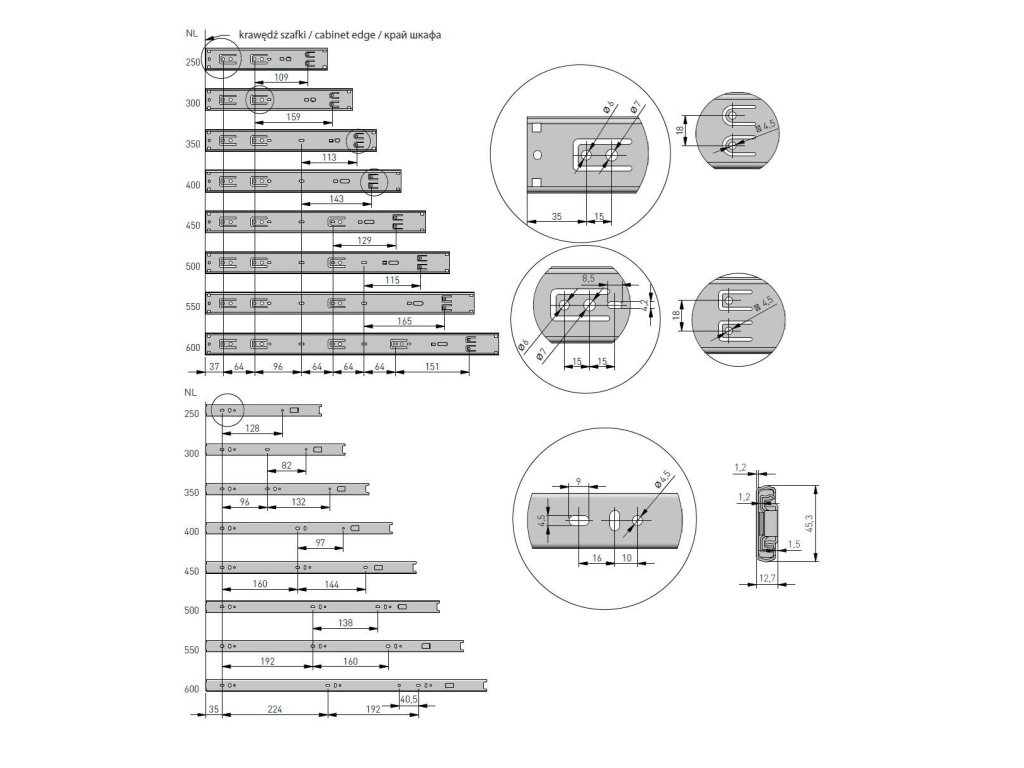 dĺžka výsuvu: 250, 300, 350, 400, 450, 500, 550, 600 mm