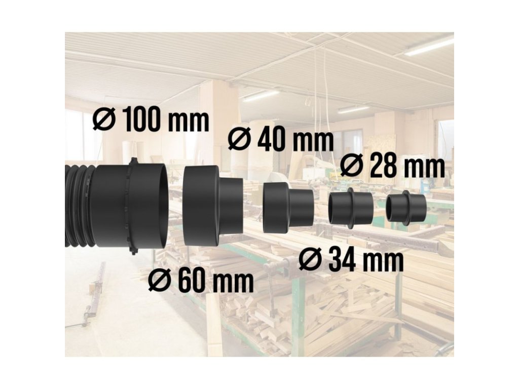 Odsávací systém pre drevoobrábacie stroje s pripojením na odsávanie pre hobby využitie, skladaný filter, jemné prachové rúno, papierové filtre, dĺžka hadice 2 m, vrátane adaptéra na všetky bežné prípojky (100/60/40/34/28 mm).