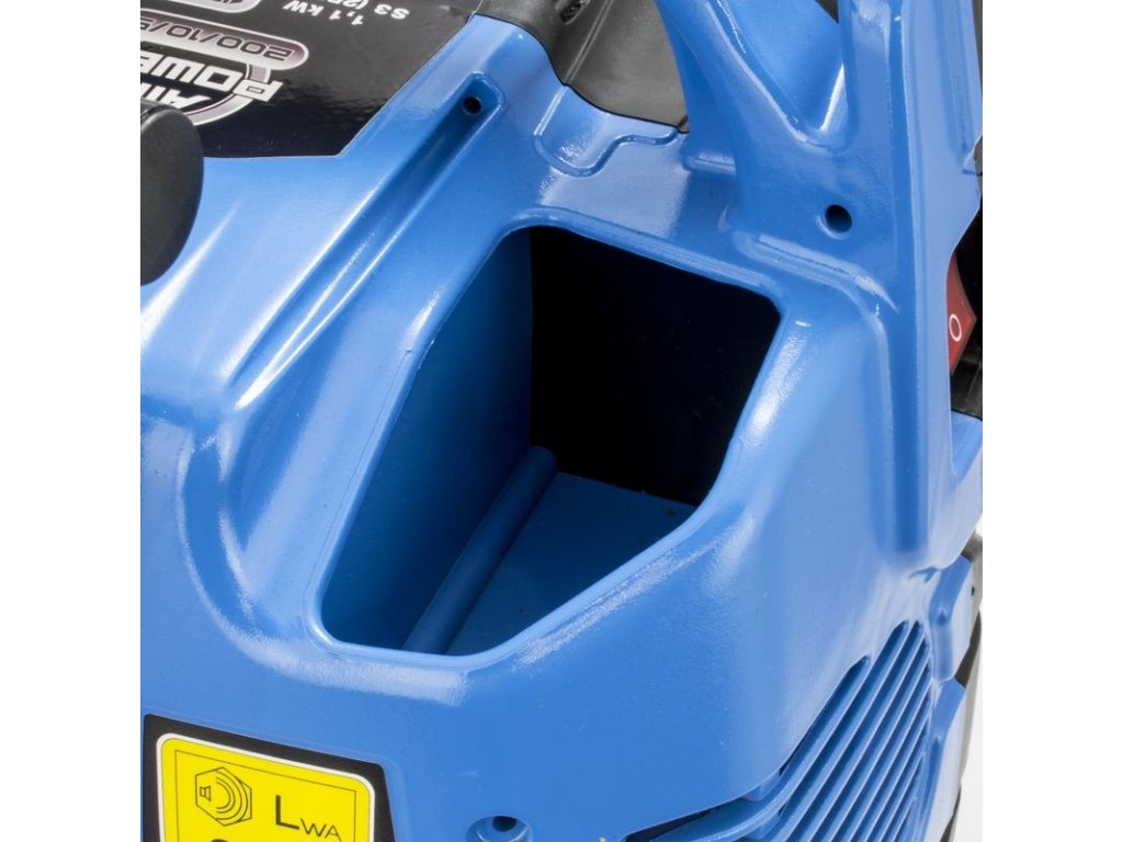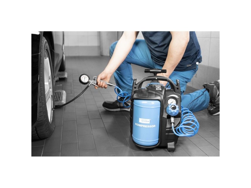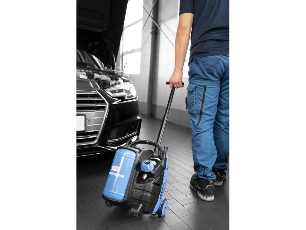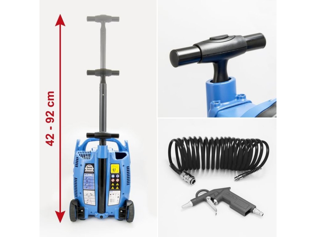 Bezolejový 1-valcový piestový kompresor s remeňovým pohonom, rukoväť, redukcia tlaku s manometrom, 1 spojka stlačeného vzduchu, poistný ventil a skrutka na vypúšťanie kondenzátu, integrovaný tlakový spínač. Úložný priestor pre napájací kábel, odkladací priestor. Jednoduchý transport vďaka konštrukcii vozíka. Špirálová hadica 5 m, fúkacia pištoľ.