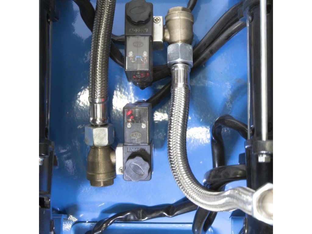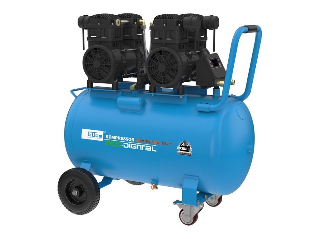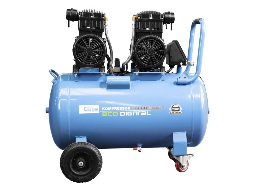 Bezolejový štvorvalcový piestový kompresor, 2 dvojpiestové agregáty so samostatným motorom, 4 vzduchové filtre, 2 prepínacie relé pre oneskorený štart. Digitálny tlakový spínač s časomeračom, digitálne nastaviteľný riadiaci a odpájací tlak, 100-litrová nádrž. Rukoväť na prenášanie a riadiace kolieska. Tichý chod. Dve pneumatická spojky, bezpečnostný ventil a vypúšťacia skrutka na kondenzát.