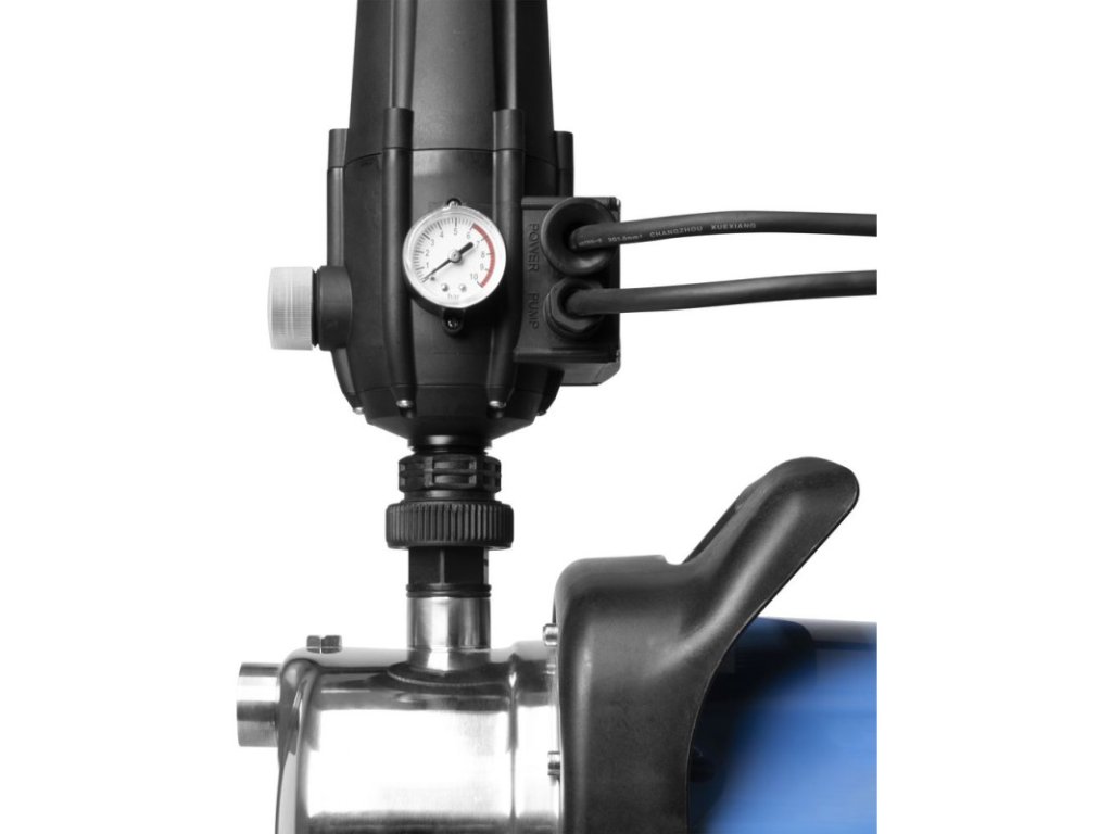 Tlakový spínač a ochrana proti chodu na sucho k dovybaveniu záhradných čerpadiel, komplet so spojkou 230 V a zástrčkou. Jediným stlačením tlačítka Restart sa dá tlakový spínač opäť aktivovať.