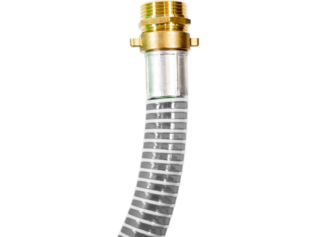 Špirálová sacia garnitúra s mosadznými armatúrami, mosadzným spätným ventilom so sacím košom z ušľachtilej ocele, zalisované koncovky. S prípojkou Vario pre vonkajší a vnútorný závit.
